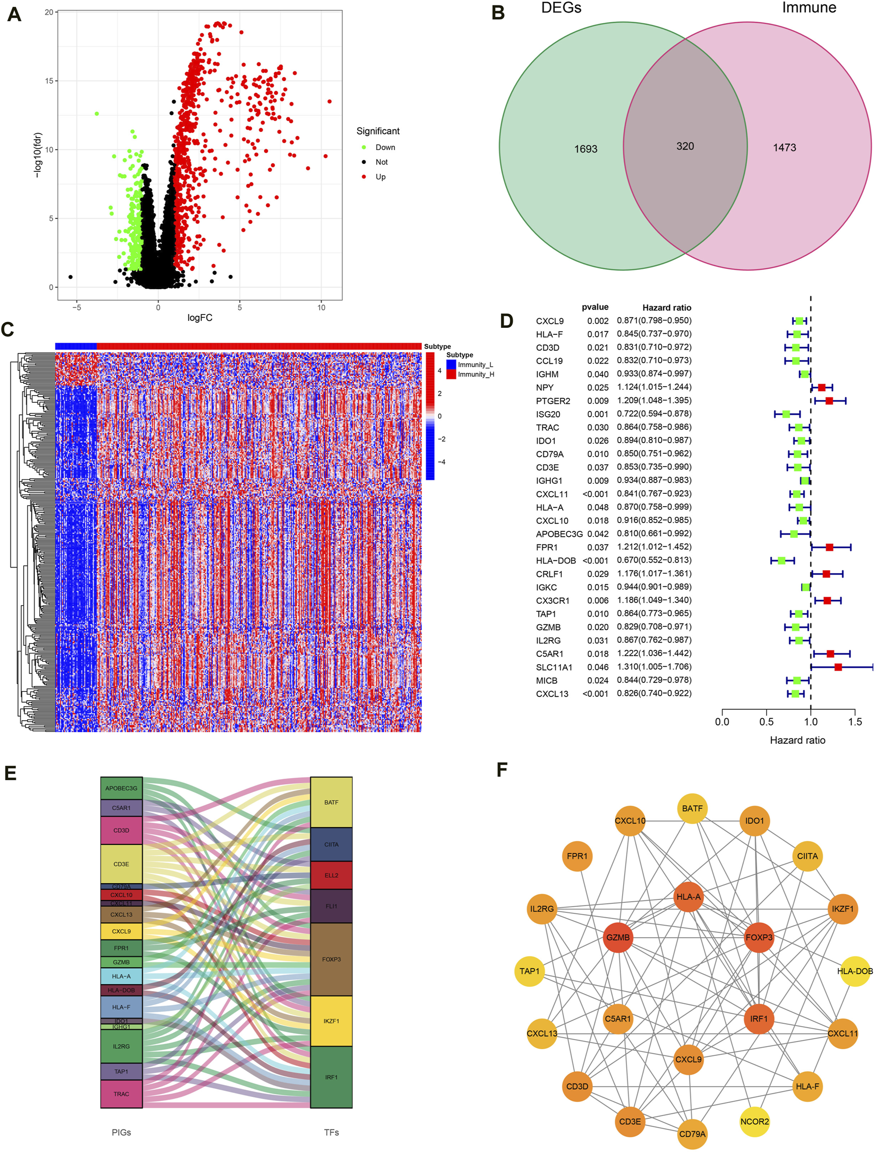 Construction of IRG signatures. (A) Volcano plot of DEGs. (B) Venn diagram of DEGs and IGs. (C) Differential expression heatmap of IRGs in high and low immune groups. (D) Forest map of prognosis related IRGs. (E) Sankey diagram of prognosis related IRGs and TF. (F) PPI network diagram of prognosis related IRGs.