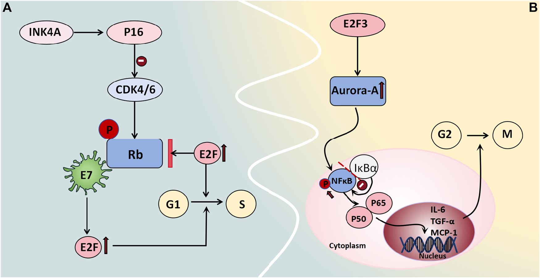 Cell cycle regulators associated with BOT development. (A) Rb binds to the transcription factor E2F as a growth inhibitor, regulating the cell cycle and tumor progression. Phosphorylation by CDKs causes Rb to dissociate from E2F, promoting E2F-mediated transcription and facilitating entry into the S phase of the cell cycle, thereby activating gene transcription and enhancing cell proliferation. The viral oncogene E7 also interacts with Rb protein to release E2F and facilitate cell cycle progression. (B) Aurora-A is regulated by E2F3 in transcription, mediating the carcinogenic function of E2F3. Aurora-A kinase phosphorylates NFκB, releasing it from its inhibitor IκBα and allowing translocation of the P65/P50 complex to the cell nucleus. This complex then acts on target genes like IL-6, TGF-α, and MCP-1 to regulate cell survival and apoptosis.