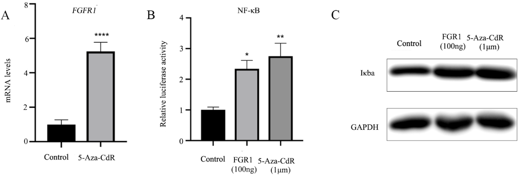 Figure 2. 5-Aza-CdR increases the FGFR1 mRNA expression and activates the NF-κB signaling pathway. (A) RT-qPCR examined FGFR1 mRNA levels in BEAS-2B cells incubated with 1 um 5-Aza-CdR for 48 h or not. (B) Luciferase-based NF-Kb was determined in BEAS-2B cells incubated with 1 um 5-Aza-CdR for 48 h or transfected with FGFR1-overexpression plasmids. (C) Western blot detection of Iκba protein expression in BEAS-2B cells incubated with 1 um 5-Aza-CdR for 48 h or transfected with FGFR1-overexpressing plasmids. *, **, *** represents as p < 0.05, p < 0.001 and p < 0.00001, respectively.
