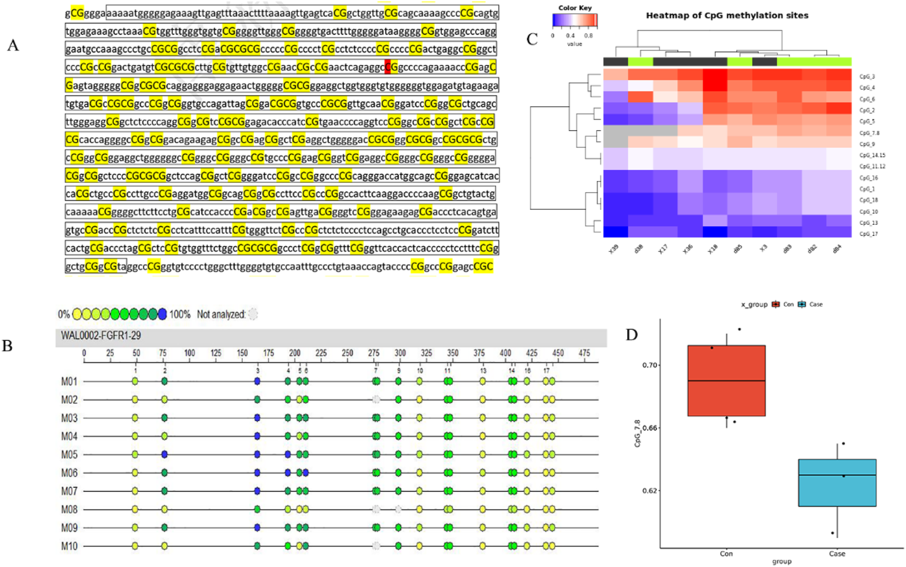 DNA was extracted from extracellular DNA in peripheral blood samples using a cfDNA Library Kit from Beijing Baiaolaibo Technology Co., Ltd., China. Quantification of DNA was performed using a NANODROP 1000. Methylation analysis of FGFR1 at a concentration of 300 ng/μL was carried out by BioMiao Biological Technology (Beijing) Co., Ltd. The isolated DNA underwent sodium bisulfite treatment and PCR amplification using the PyroMark PCR Kit to enrich FGFR1 sequences. The extracted extracellular DNA was then subjected to methylation. After SAP treatment (2 µg DNA), the samples (500 ng) were analyzed for targeted CpG island methylation using the MALDI-TOF MassARRAY system on a SpectroCHIP. The specific primers used were: 5′AGGAAGAGAGTTATTGTAGGTTGGAGATTTTTGGA3'; 3′CAGTAATACGACTCACTATAGGGAGAAGGCTACCCTTCTCTTCCTACAACCTAATC5'.