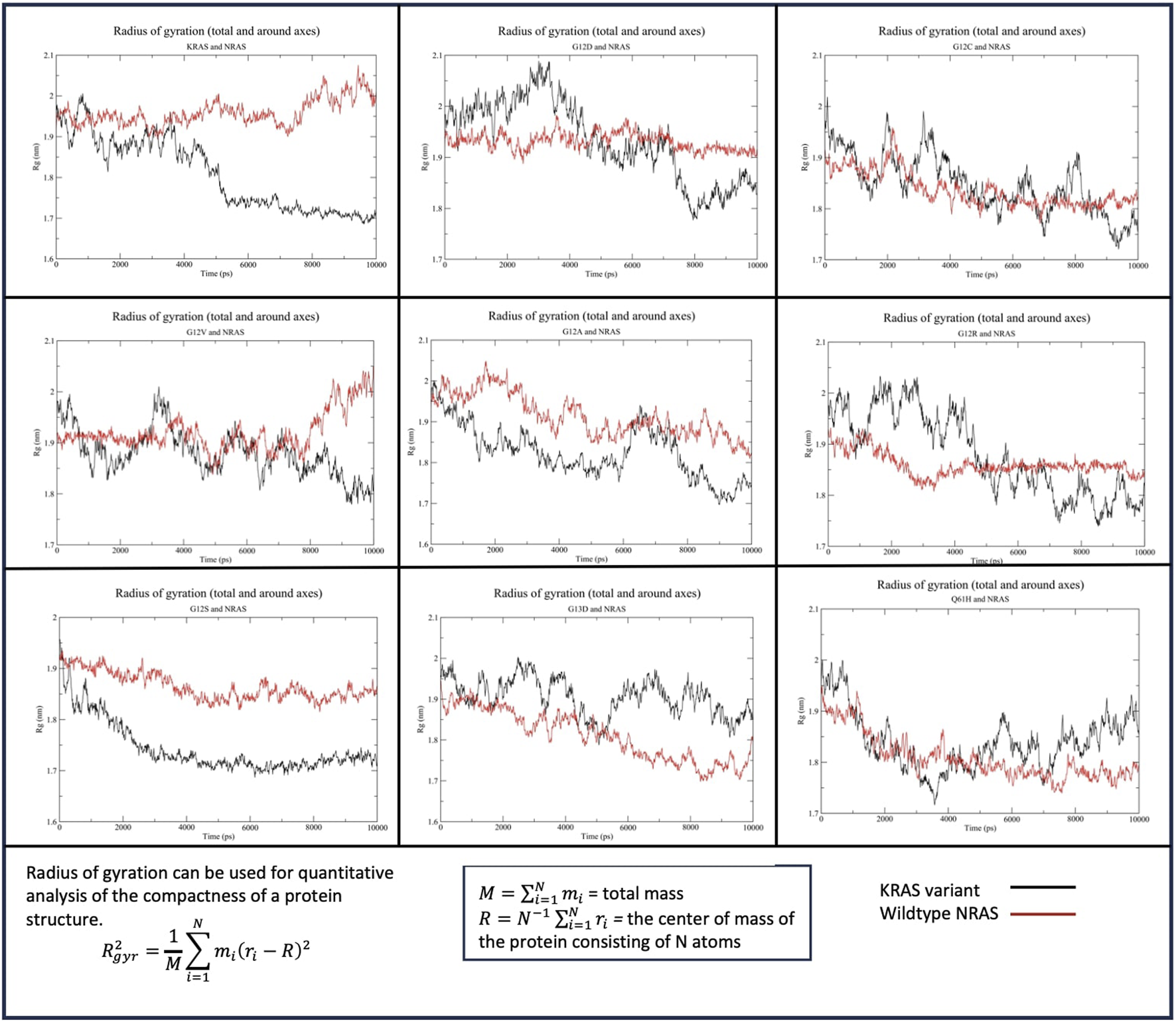 Figure 5. Radius of gyration (Rg) of the KRAS variants with WT-NRAS. The average distance protein residues from the center of the protein were plotted against time for the KRAS variants and WT-NRAS. A smaller Rg signified a denser protein, while a higher Rg indicated a decrease in overall compactness. Mutation in KRAS was observed to influence the density of both proteins.