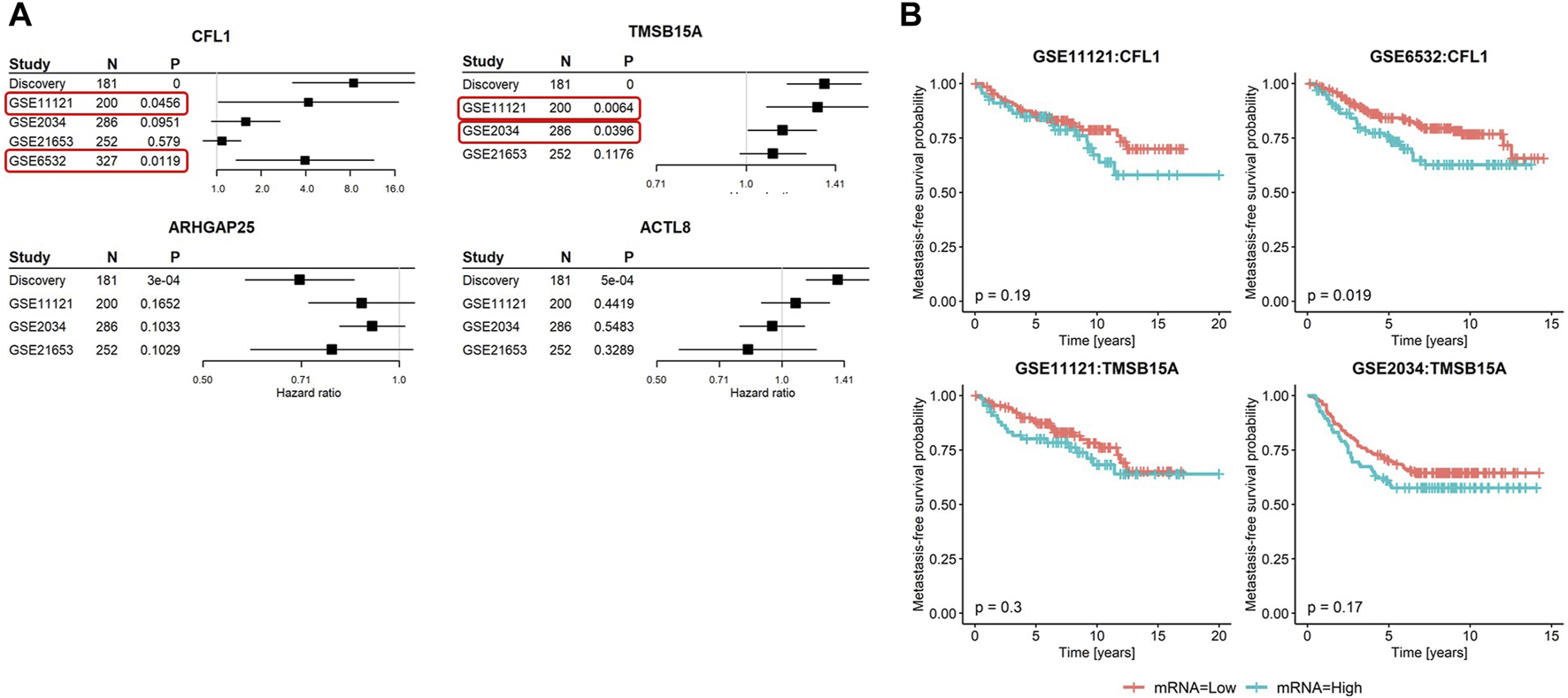 Summary of metastasis-free survival analyses in the discovery and validation cohorts. (A) Forest plots of the four candidate genes showing hazard ratios, 95% confidence intervals, p-values, and sample sizes of the discovery and three to four published breast cancer cohorts. In GSE6532, only the mRNA of CFL1 was captured. (B) Kaplan–Meier curves stratified based on the second tertile of candidate genes meeting the validation criteria in relation to metastasis-free survival probabilities. Red rectangles highlight the validation cohorts that led to the successful validation of the corresponding genes.