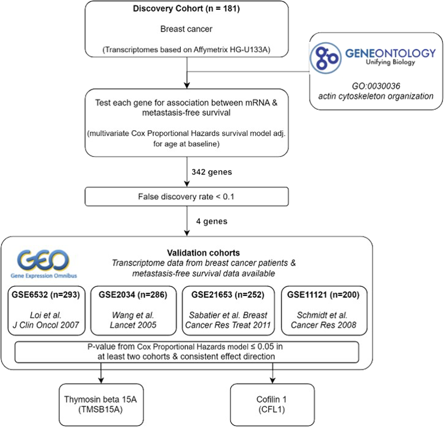 All genes belonging to the Gene Ontology term “actin cytoskeleton organization” (GO:0030036) were obtained from QuickGO (Binns et al., 2009) and filtered for presence in the transcriptome dataset of the discovery cohort. The remaining list was manually filtered for those directly interacting with actin or belonging to the RhoGTPases and their regulators. The mRNA of each ABP was tested for association with metastasis-free survival probability using Cox proportional hazards regression adjusted for age at baseline examination. Genes with a false discovery rate (FDR) ≤ 0.05 were considered significant and considered potential candidates. The mRNA of these genes was tested for association with metastasis-free survival probability in the validation cohorts. Age at baseline examination was only used as a covariate in the Cox model in GSE6532 and GSE21653 because it was not available in GSE11121 and GSE 2034. Genes with a p-value ≤0.05 and a consistent effect direction, compared to the discovery, were considered candidates. Candidate gene expression was stratified based on the first quartile for hazard ratios smaller than one, and otherwise, the third quartile was used and visualized as Kaplan–Meier curves, including p-values from the log-rank tests.