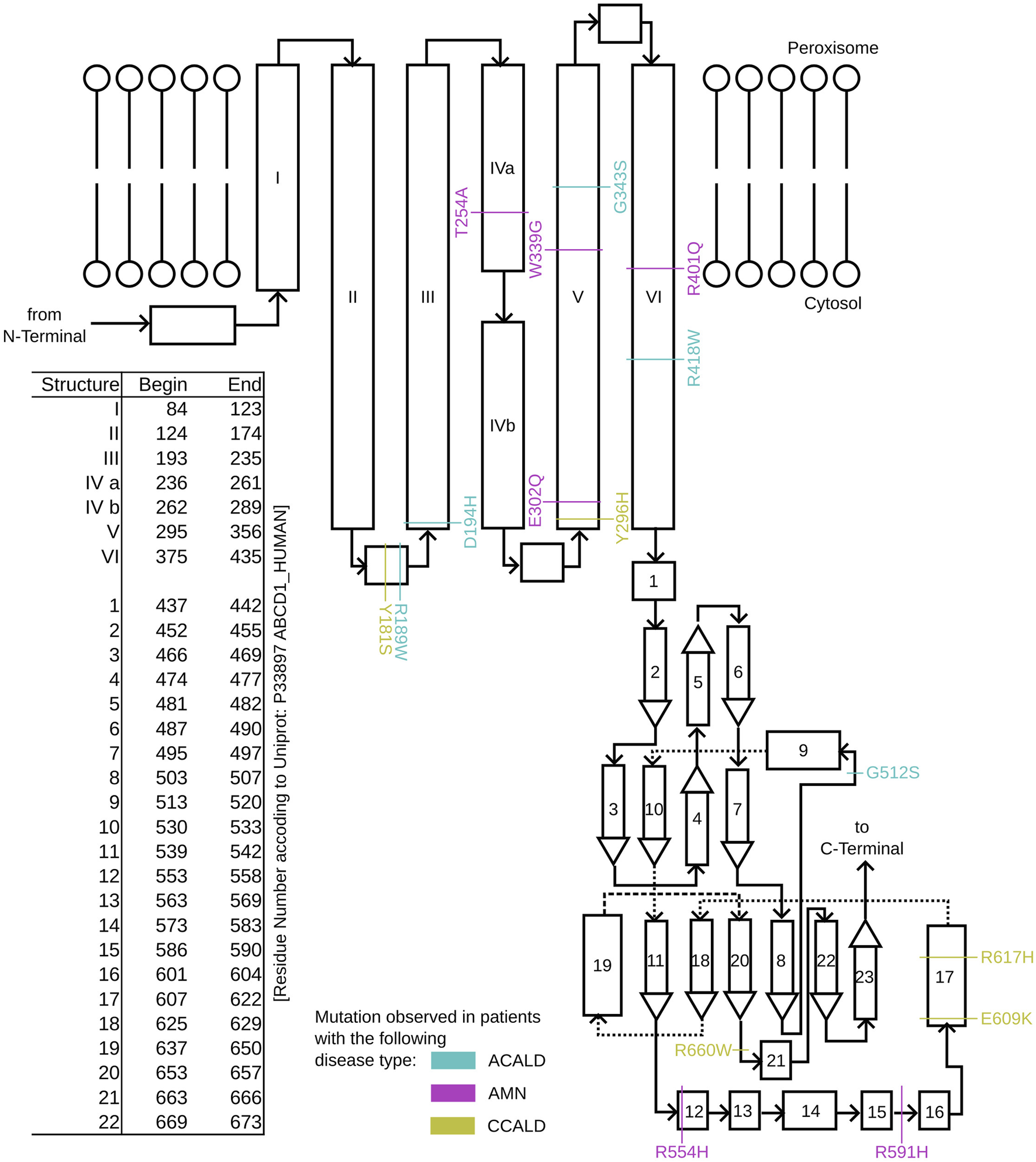 A schematic overview of the structure of single ABCD1 monomer with a list of residue positions. Positions are denoted for mutations associated with XALD disease progression in the form of ACALD (cyan), AMN (magenta), and CCALD (yellow).
