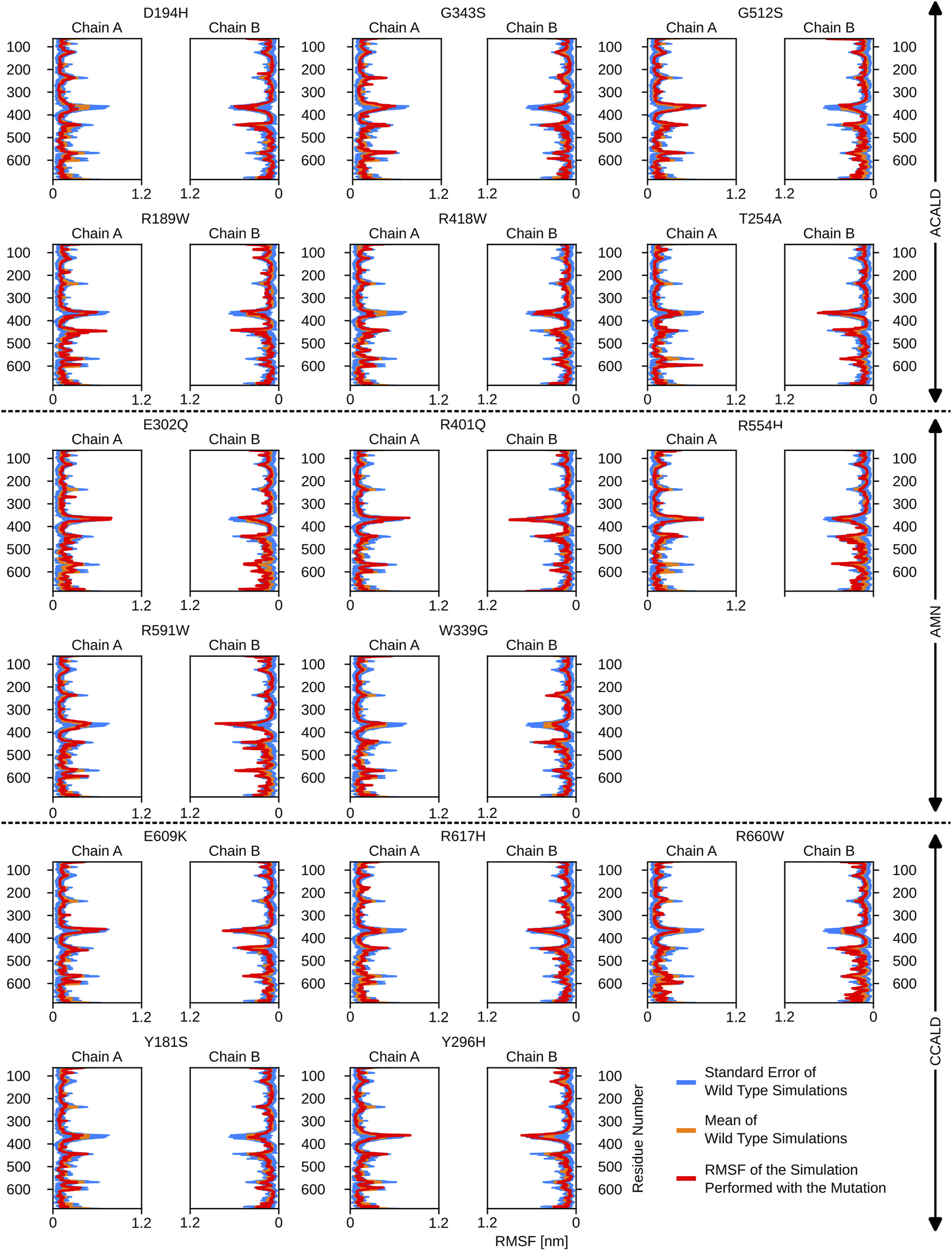 Basic trajectory analysis was conducted on each trajectory using GROMACS tools to calculate the root mean square fluctuations (RMSFs) for the protein chains’ carbon- atoms. This analysis provided a per-residue estimate of flexibility and allowed us to identify flexible areas of the ABCD1 transporter. To establish a baseline, the deviation of the four wild-type simulations was calculated and plotted in blue on individual graphs, while the mean of the wild-type simulations was plotted in yellow on the same graph. The RMSF of a mutated form of the protein was then plotted in red in the same figure. Regions with altered flexibility were identified by comparing the red and blue curves.