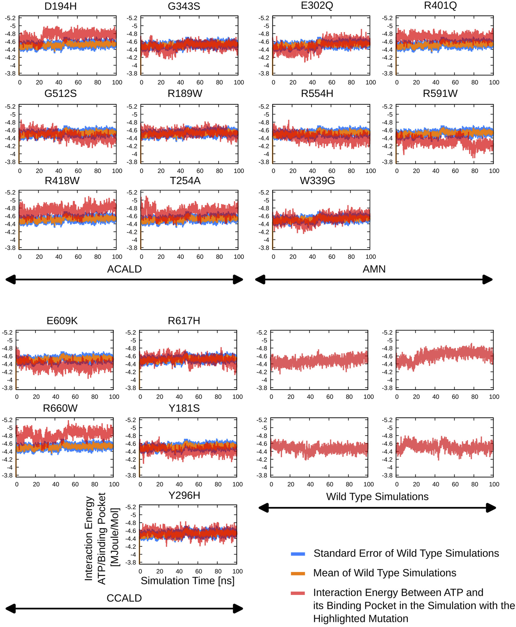 During the simulations, we sampled the energy potential of the interaction between the ATP molecule and the amino acids within a 5 range from the ATP molecule. This potential is the sum of long and short-range Lennard-Jones and Coulomb potentials as specified in the GROMOS force field (Schmid et al., 2011). Our focus was on understanding how the mutations in the ABCD1 protein affect the Protein-ATP interaction and whether they render the transporter non-functional.