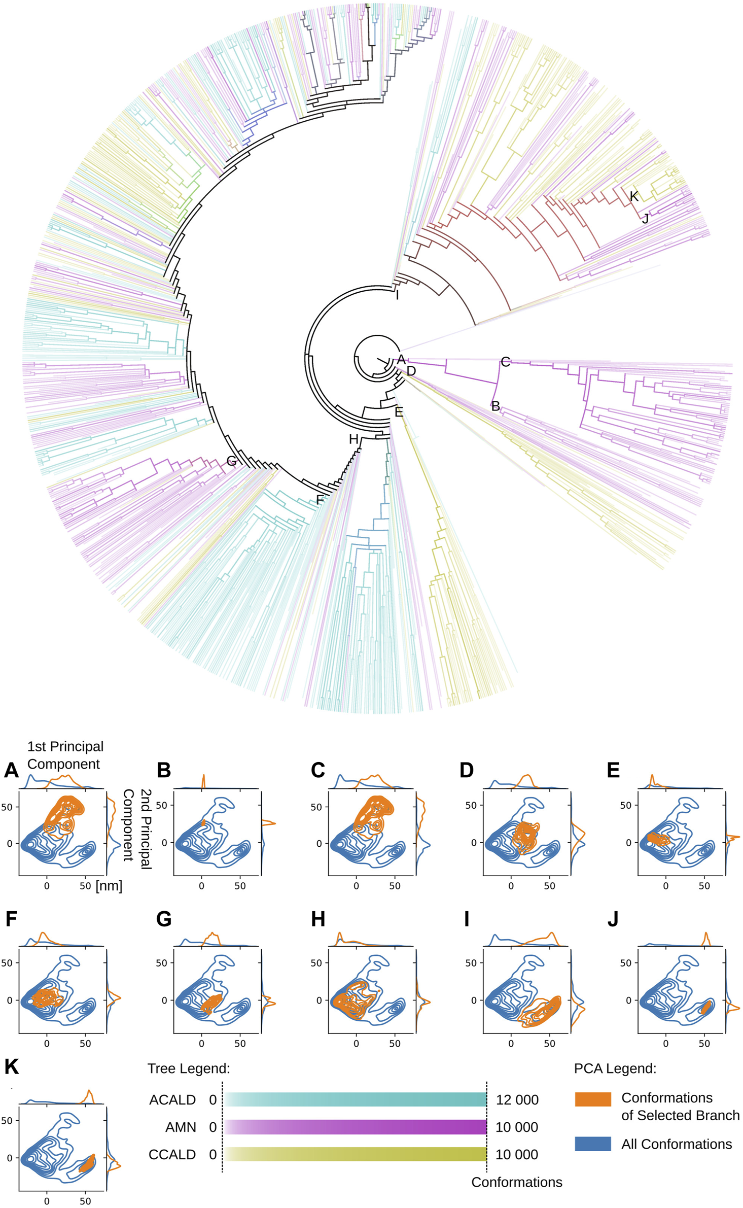 For further details of the tree building algorithm we refer the interested reader to the MNHN-Tree-Tools (Haschka et al., 2021) article, and its algorithmic supplement as well as manual. Finalized and annotated trees can be quantitatively analyzed with tools like split_set_to_fasta or split_set_to_projections, where the first one allows to identify the frame numbers (using the generated virtual FASTA file) corresponding to conformations in a tree node while the second yields the projections onto the principal components for the conformations in such a node.