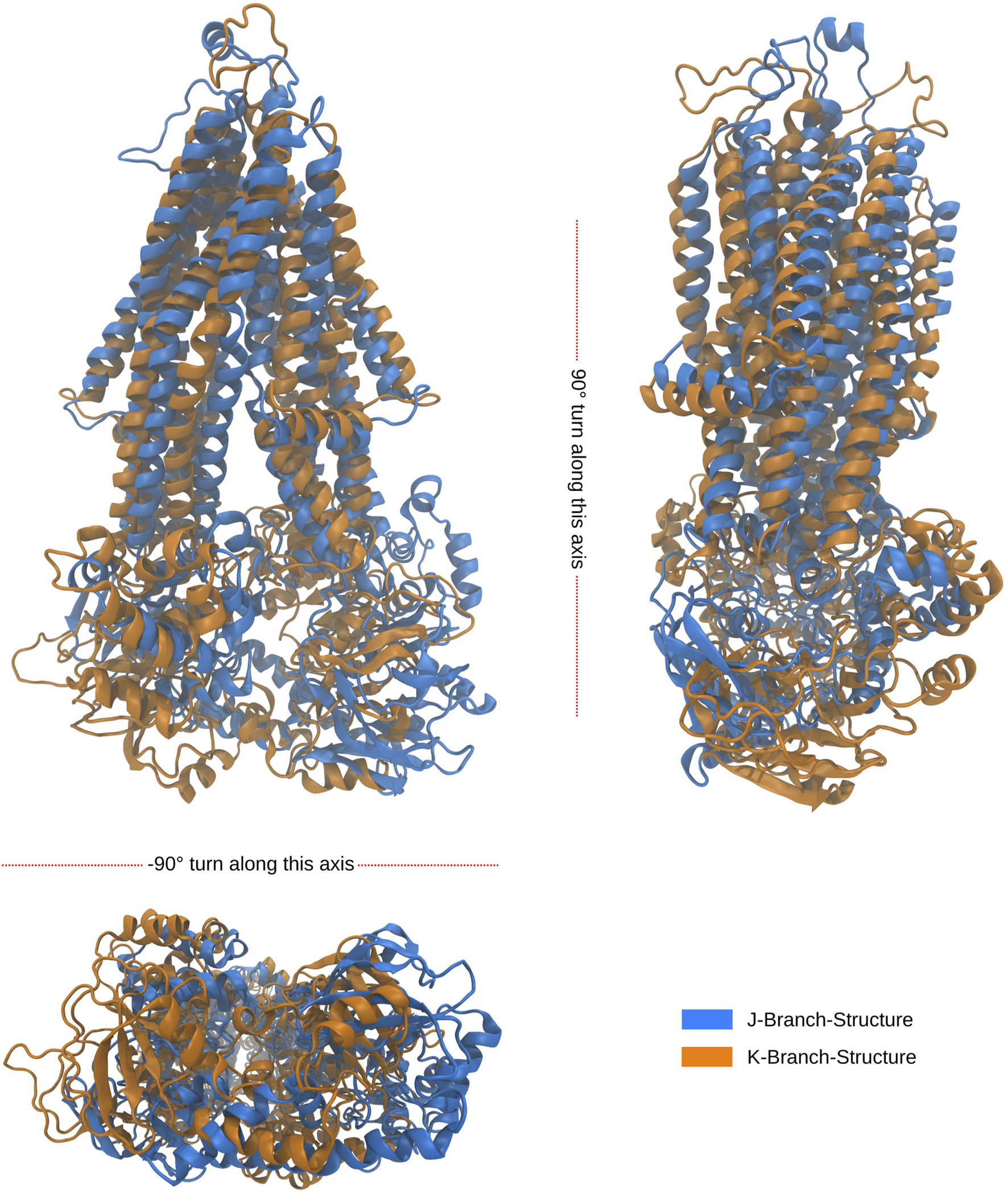 Alignment of folds of the latest, in simulation time, occurring structures from the J and K branches at outlined in Figure 9. The root mean square deviation (RMSD) between the backbone atoms of the two structures is recorded to be 1.824 nm. The J structure is representative of a cluster of 741 over 34,000 structures, while the K structure is representative of a cluster of 576 over 34,000 structures. Both clusters were found to be a density connected ensembles of structures satisfying for in the 10 dimensional PCA subspace.