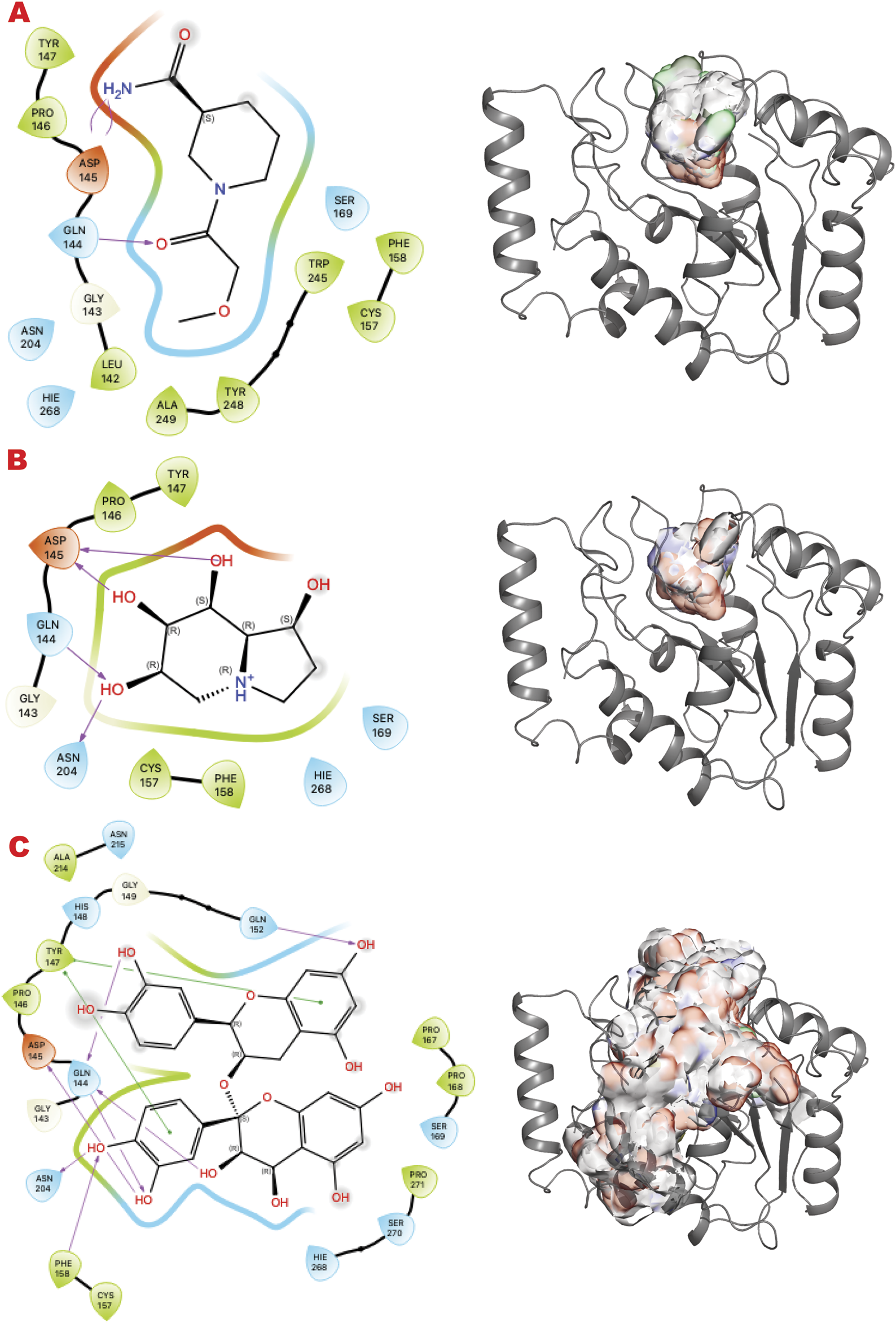 Figure 4. UDG VS targeting results. (A) VS1 result, from DSI-poised library, from left 2D ligand interactive map of VS1 result, compound 1-(2-methoxyacetyl)piperidine-3-carboxamide, right VS2+VS1 results electrostatic maps from DSI-poised library targeting UDG catalytic domain; (B) VS1 result, from PDB-fragments library, from left 2D ligand interactive map of VS1 result, compound octahydroindolizine-1,6,7,8-tetrol, right VS2+VS1 results electrostatic maps from PDB-fragments library targeting UDG catalytic domain; (C) VS1 result, from LH1 FDA-approved drugs library, from left 2D ligand interactive map of VS1 result, compound Proanthocyanidins, right VS2+VS1 results electrostatic maps from LH1 FDA-approved drugs library targeting UDG catalytic domain.