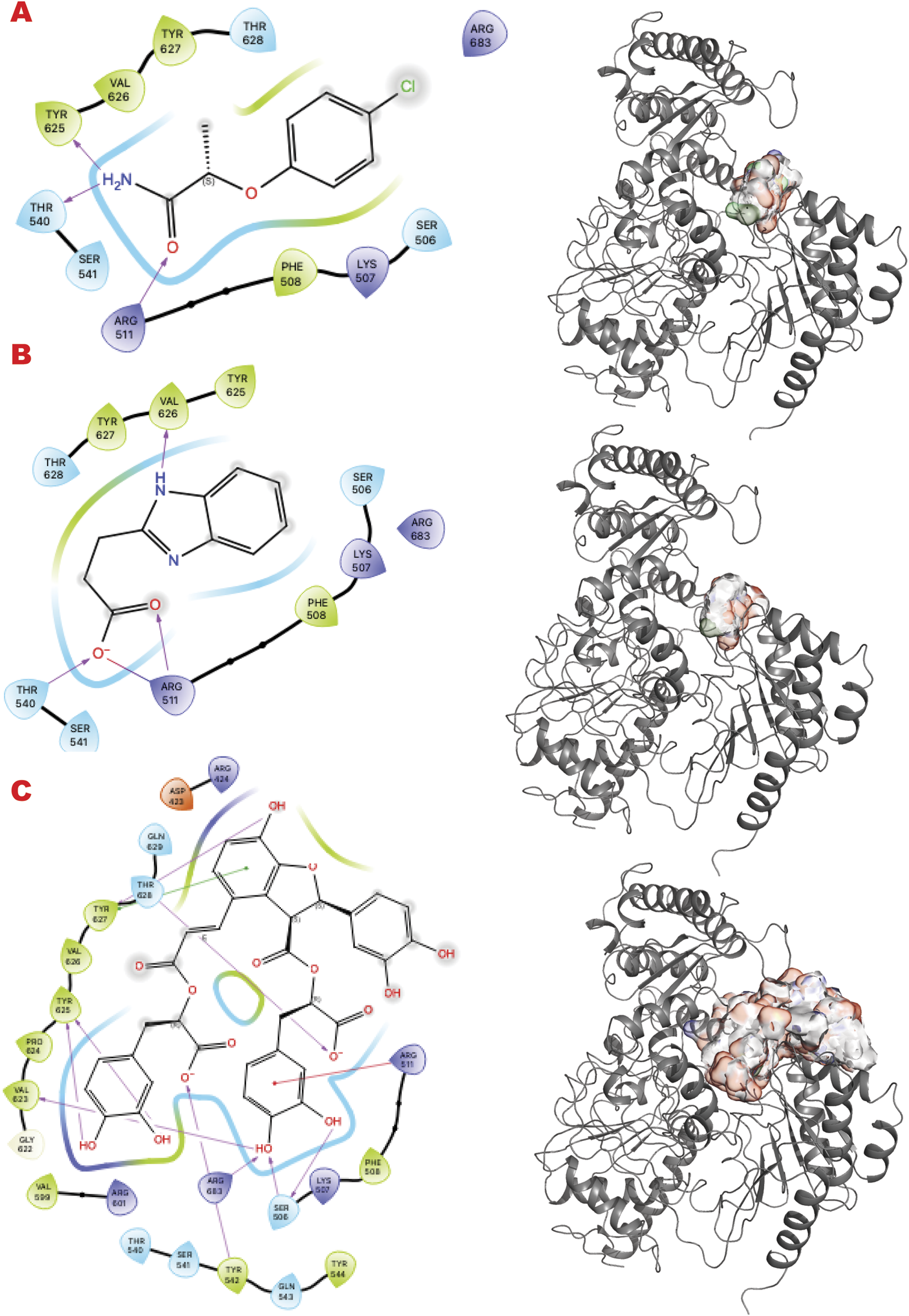 XPD VS targeting results. (A) VS1 result, from DSI-poised library, from left 2D ligand interactive map of VS1 result, compound 2-(4-chlorophenoxy)propenamide, right VS2+VS1 results electrostatic maps from DSI-poised library targeting XPD helicase domain; (B) VS1 result, from PDB-fragments library, from left 2D ligand interactive map of VS1 result, compound Procodazole, right VS2+VS1 results electrostatic maps from PDB-fragments library targeting XPD helicase domain; (C) VS1 result, from LH1 FDA-approved drugs library, from left 2D ligand interactive map of VS1 result, compound Salvianolic Acid B, right VS2+VS1 results electrostatic maps from LH1 FDA-approved drugs library targeting XPD helicase domain.