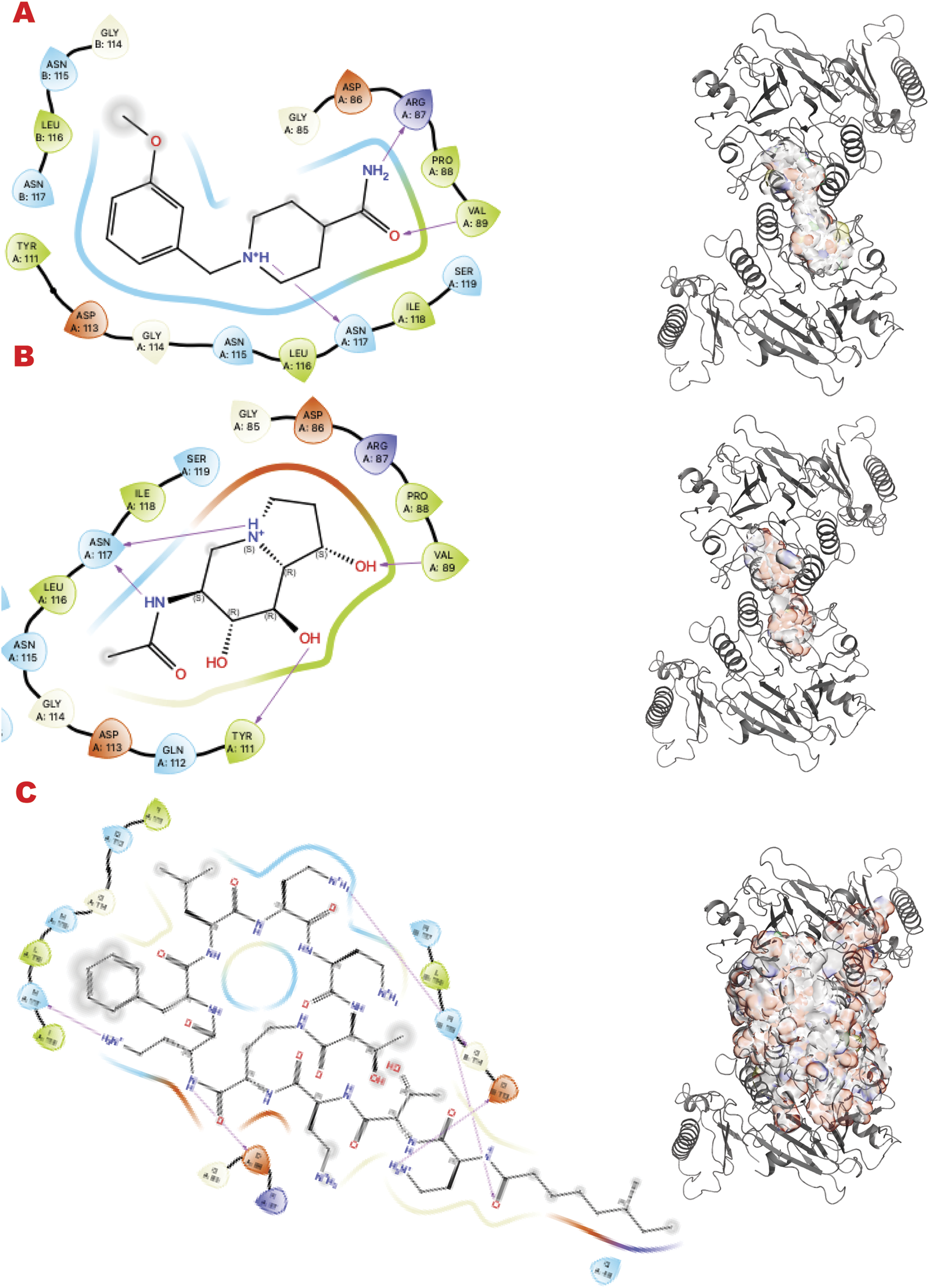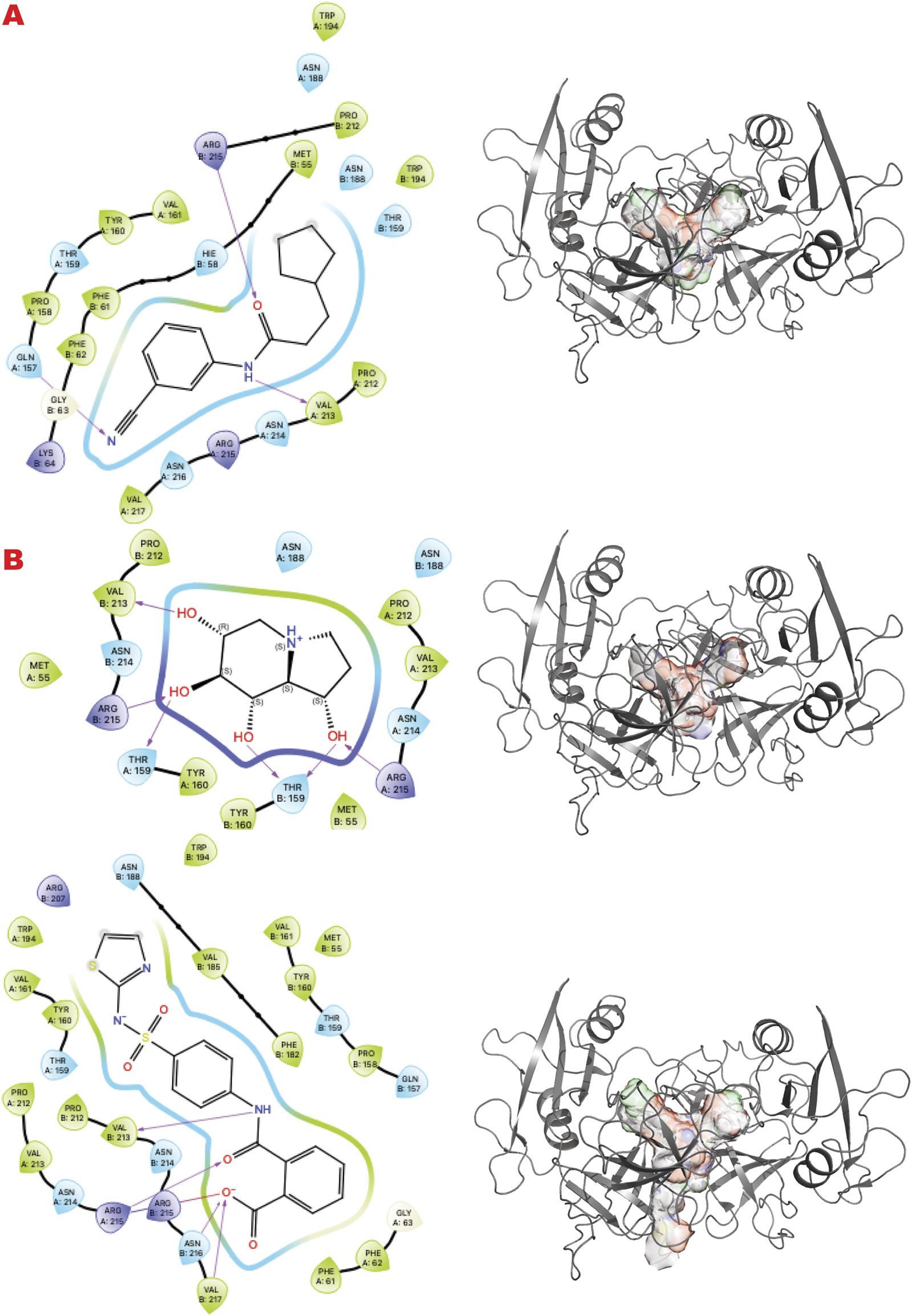 GRB2 dimer VS targeting results. (A) VS1 result, from DSI-poised library, from left 2D ligand interactive map of VS1 result, compound N-(3-cyanophenyl)-3-cyclopentylpropanamide, right VS2+VS1 results electrostatic maps from DSI-poised library targeting GRB2 dimer; (B) VS1 result, from PDB-fragments library, from left 2D ligand interactive map of VS1 result, compound octahydroindolizine-1,6,7,8-tetrol, right VS2+VS1 results electrostatic maps from PDB-fragments library targeting GRB2 dimer; (C) VS1 result, from LH1 FDA-approved drugs library, from left 2D ligand interactive map of VS1 result, compound Phthalylsulfathiazole, right VS2+VS1 results electrostatic maps from LH1 FDA-approved drugs library targeting GRB2 dimer.