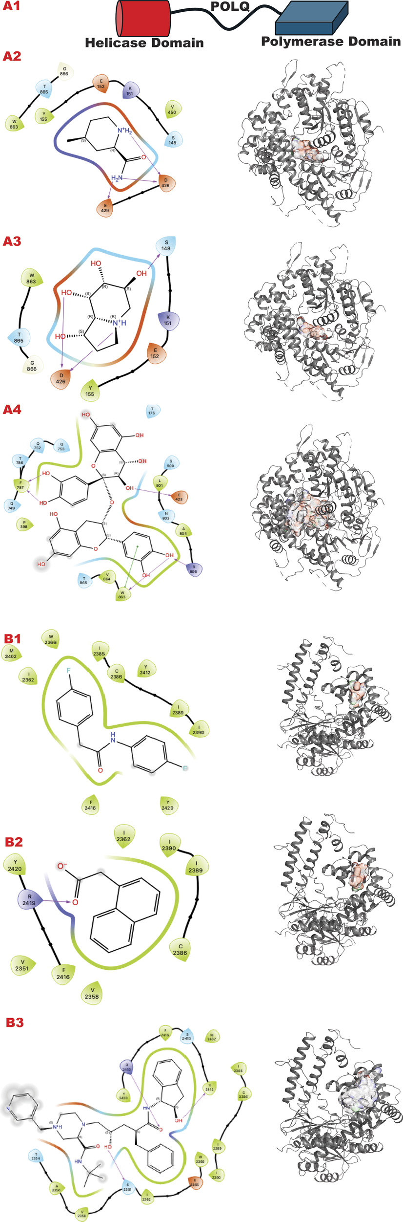 POLQ VS targeting results for its two different functional domains. Panel A. (A1) Schematic representation of POLQ and its functional domains; (A2) VS1 result, from DSI-poised library, from left 2D ligand interactive map of VS1 result, compound 4-methylpiperidine-2-carboxamide, right VS2+VS1 results electrostatic maps from DSI-poised library targeting POLQ helicase domain; (A3) VS1 result, from PDB-fragments library, from left 2D ligand interactive map of VS1 result, compound octahydroindolizine-1,6,7,8-tetrol, right VS2+VS1 results electrostatic maps from PDB-fragments library targeting POLQ helicase domain; (A4) VS1 result, from LH1 FDA-approved drugs library, from left 2D ligand interactive map of VS1 result, compound Proanthocyanidins, right VS2+VS1 results electrostatic maps from LH1 FDA-approved drugs library targeting POLQ helicase domain. Panel B. (B1) VS1 result, from DSI-poised library, from left 2D ligand interactive map of VS1 result, compound N,2-bis(4-fluorophenyl)acetamide, right VS2+VS1 results electrostatic maps from DSI-poised library targeting POLQ allosteric domain; (B2) VS1 result, from PDB-fragments library, from left 2D ligand interactive map of VS1 result, compound2-(1-naphthyl)acetic acid, right VS2+VS1 results electrostatic maps from PDB-fragments library targeting POLQ allosteric domain; (B3) VS1 result, from LH1 FDA-approved drugs library, from left 2D ligand interactive map of VS1 result, compound Indinavir sulfate, right VS2+VS1 results electrostatic maps from LH1 FDA-approved drugs library targeting POLQ allosteric domain.