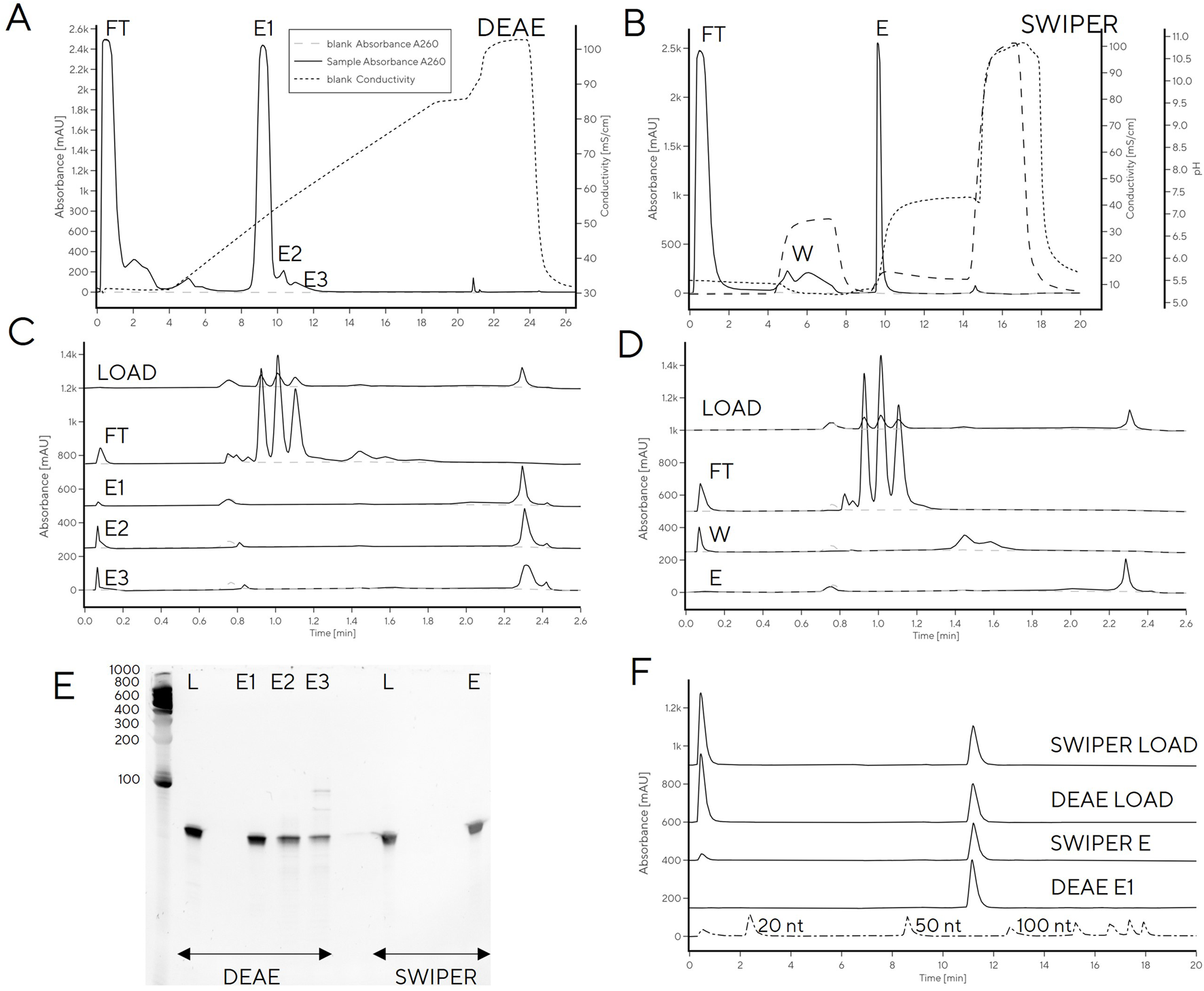 tRNA purification with (A) Swiper and (B) DEAE. CIMac PrimaS analytics of collected fractions from (C) Swiper: load, FT, Wash, Elution; and (D) Swiper: load, FT, E1, E2, and E3. (E) Fractions resolved on 10% TBE-Urea gel (left) and (F) IP-RP analysis of DEAE/Swiper elution fractions.