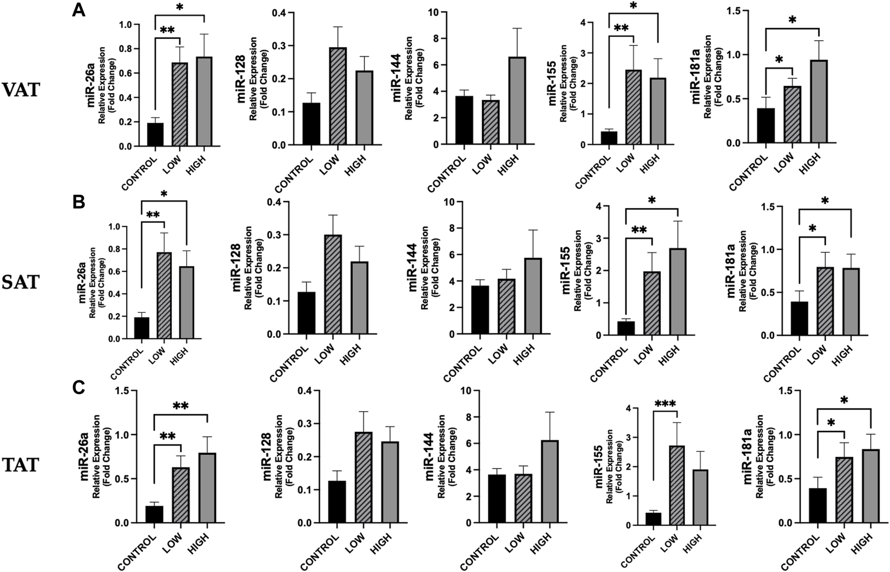 Differences in circulating miRNAs according to adiposity level among cancer patients and in controls. We analyzed the data according to the median level of adiposity, as follows: low (n = 19) vs. high (n = 18) of VAT (median: 130.70 cm2), SAT (median: 167.57 cm2), and TAT (median: 322.56 cm2) and in controls (n = 14). [(A), from left to right] Data show higher expression of miR-26a (p = 0.003), miR-155 (p = 0.004) and miR-181 (p = 0.023) in cancer patients with low VAT vs. controls and higher expression of these miRs in cancer patients with high VAT vs. controls (p = 0.011, p = 0.024, p = 0.012, respectively) [(B), from left to right] Expression levels of miR-26a, miR-155 and miR-181 were higher in cancer patients with low SAT vs. controls (p = 0.004, p = 0.006 and p = 0.016, respectively) and were also significantly higher in cancer patients with high SAT vs. controls (p = 0.010, p = 0.019 and p = 0.018, respectively). [(C), from left to right] Considering TAT, we observed that miR-26a, miR-155 and miR-181 were higher in cancer patients with low TAT vs. controls (p = 0.008, p = 0.001 and p = 0.022, respectively) and that miR-26a and miR-181a were higher in cancer patients with high TAT vs. controls (p = 0.004 and p = 0.012, respectively). *p < 0.05, **p ≤ 0.01, ***p ≤ 0.001. Abbreviations: VAT, visceral adipose tissue; SAT, subcutaneous adipose tissue; TAT, total adipose tissue.