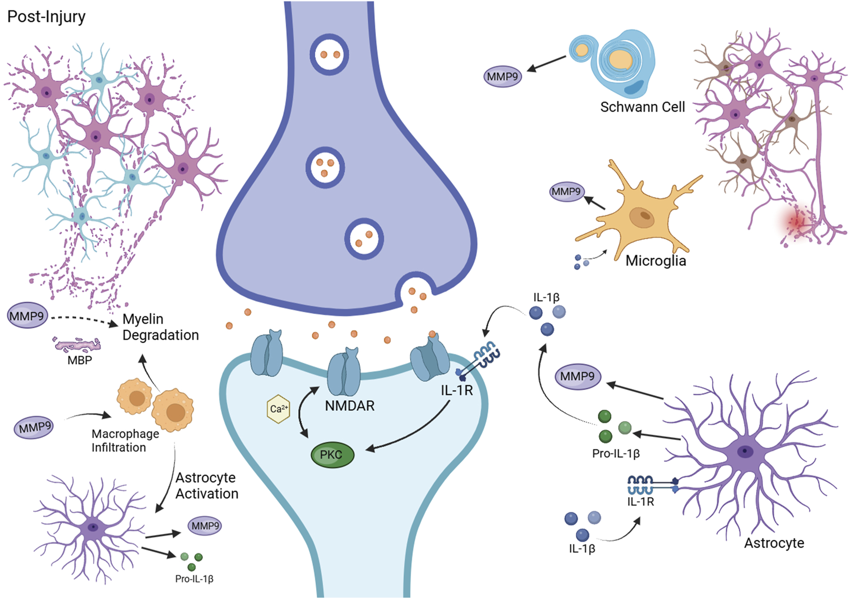 MMP9 in Neuropathic Pain Pathophysiology. This figure depicts the contribution of MMP9 to neuropathic pain following injury. It shows MMP9 release from Schwann cells, microglia, and astrocytes, its role in pro-IL-1β activation, and the ensuing neuronal sensitization and myelin degradation. Additionally, it illustrates macrophage infiltration and astrocyte activation, highlighting the inflammatory and neuropathic responses. Created with BioRender.com.