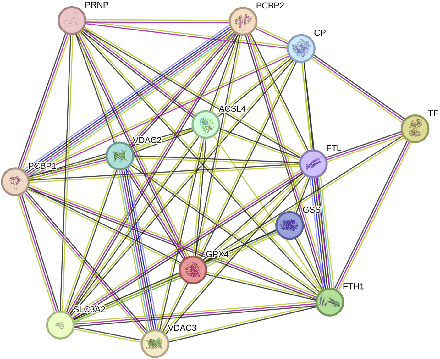 Interactions among 13 ferroptosis-related proteins in urinary exosomes.