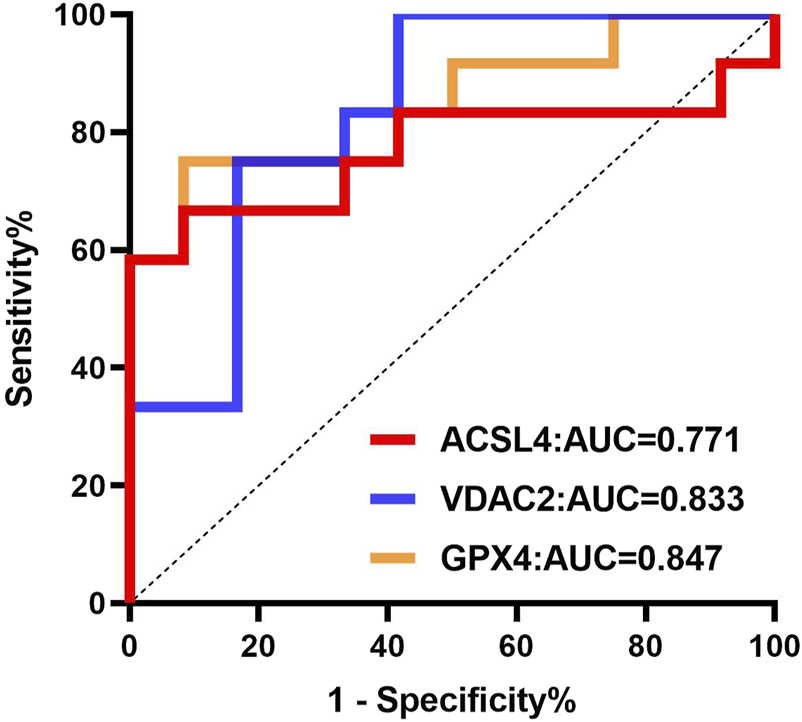 The clinical value of ferroptosis-related differential proteins for auxiliary monitoring of acute gout attacks is summarized in Table 2 and Figure 7. In our study, three ferroptosis-related differential proteins showed statistically significant results in ROC analysis. The area under the curve (AUC) for urinary exosome ACSL4 was 0.771 (95% CI, 0.561–0.981), for urinary exosome VDAC2 it was 0.833 (95% CI, 0.668–0.999), and for urinary exosomal GPX4 it was 0.722 (95% CI, 0.687–1.000). In summary, differential proteins related to ferroptosis found in urinary exosomes may serve as potential biomarkers for monitoring acute gout attacks.