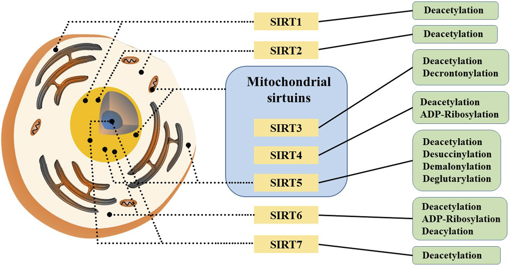 Sirtuins (SIRTs) are a family of nicotinamide adenine dinucleotide (NAD) -dependent histone deacetylases (HDACs), a group of evolutionally-conserved enzymes involved in post-translational modifications of proteins, including deacetylation, polyADP ribosylation, depropionylation, and lipoamidination. SIRTs are found in many cells and various organisms, and they has been discovered and explored in mammals over the past 2 decades (Chen B. et al., 2015). So far, seven members of this family have been identified in mammals: SIRT1-7, each member contains a conserved NAD-binding and catalytic domain (their N-terminus and C-terminus are distinct), known as the sirtuin core domain, which leads to distinct catalytic functions, subcellular localizations and substrate specificities. Meanwhile, sirtuin family members are capable of sensing cellular NAD+ levels (Bonkowski and Sinclair, 2016).