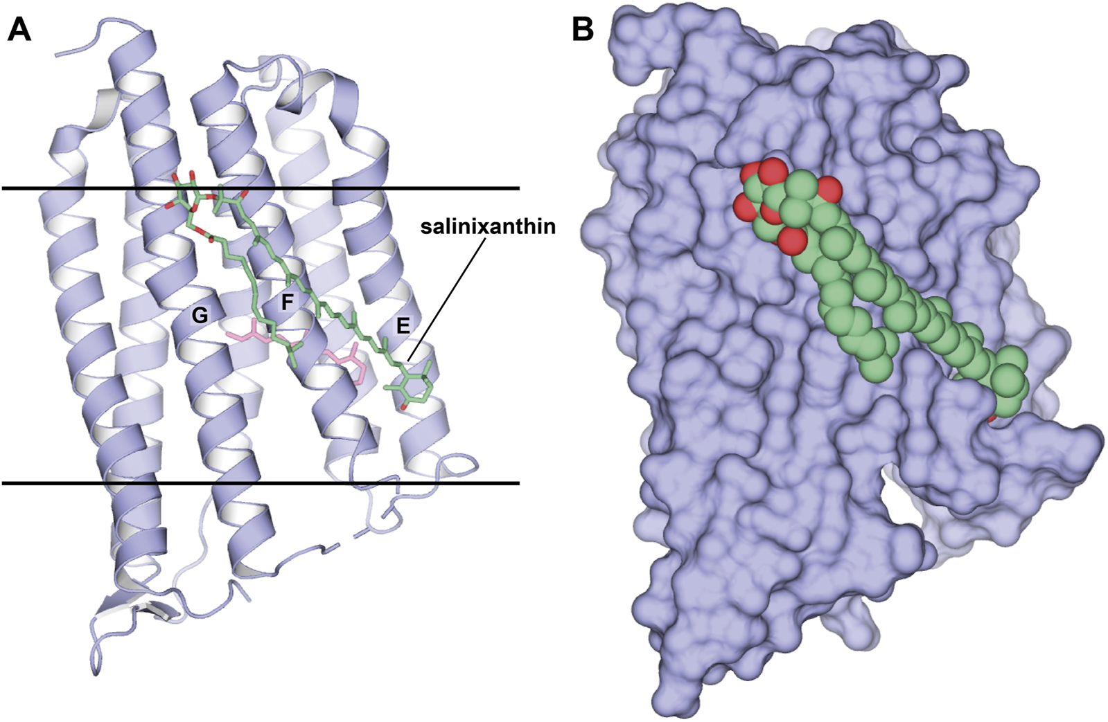 Figure 5. Structure of XR in a complex with the second chromophore. (A, B), Structure, obtained from bicelles crystallization [PDB ID: 3DDL (Luecke et al., 2008)], is shown as cartoon and surface, respectively. The second chromophore, salinixanthin, is shown as sticks and spheres, correspondingly. (A), Calculated hydrophobic-hydrophilic boundaries (Lomize et al., 2012) are shown with lines.