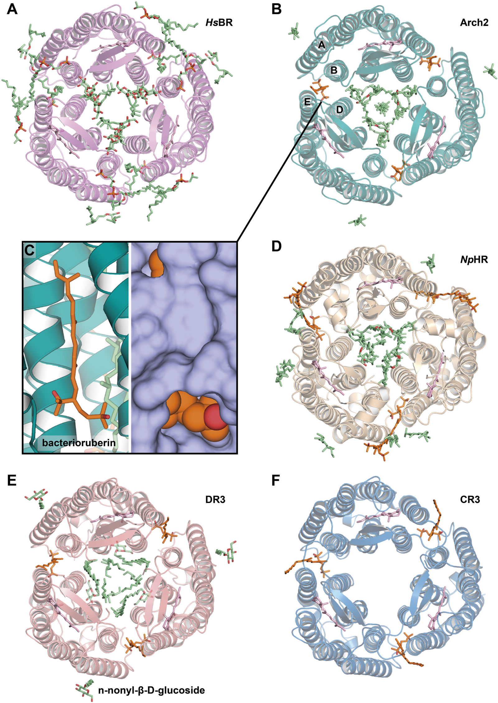 Figure 6. Lipids, resolved with membrane fusion method of crystallization. (A), HsBR [PDB ID: 1QM8 (Takeda et al., 1998)] (B), Arch2 [PDB ID: 3WQJ (Kouyama et al., 2014)]. Bacterioruberin molecule is colored orange, and its binding site between helices A and B of one protomer and D and E of another is shown closer on the figure (C). (D), NpHR [PDB ID: 3A7K (Kouyama et al., 2010)] (E), DR3 [PDB ID: 4FBZ (Zhang et al., 2013)] (F), CR3 [PDB ID: 4L35 (Chan et al., 2014)]. All the structures are shown from the extracellular side.