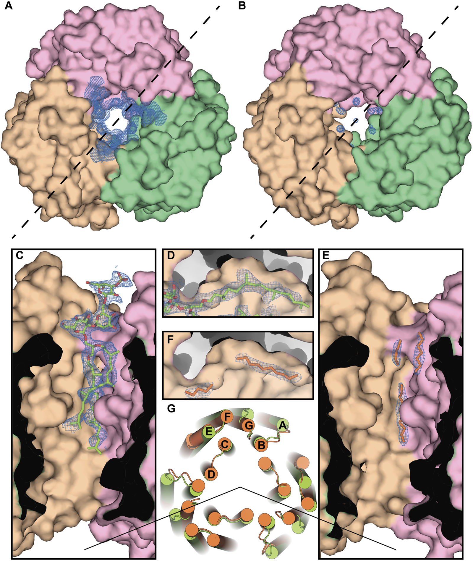 Figure 7. Specificity of the lipid-MP interactions in HsBR. (A), Crystal structure of the ground state of HsBR expressed in native archaea [PDB ID: 1IW6 (Matsui et al., 2002)], a view from the extracellular side. In the panel, we show the 2mFo-DFc maps around the lipid in the central compartment taken from the structure of the M state of HsBR [PDB ID: 2ZZL (Yamamoto et al., 2009)] due to the absence in the PDB of structural factors for the ground state structure. The trimer was generated by applying symmetry operators to the HsBR molecule. (B), Crystal structure of the ground state of E. coli-expressed HsBR [PDB ID: 4XXJ (Bratanov et al., 2015)]. Chains A, B, and C of the protein are colored pink, brown, and green, respectively. (C, E), Section for both structures by the dashed line, correspondingly. Electron density (contoured at 1 r.m.s. level) unambiguously shows the purple membrane S-TGA-1 lipid (colored light green) in the H. salinarum-expressed structure. In the case of the E. coli-expressed protein, linear carbohydrates of the anticipated bacterial lipids (colored orange) mimicked the glycolipid only partly, resulting in discontinuous electron densities (contoured at 1 r.m.s. level). (D, F), The protein has the cavity, intended for the isoprenoid lipids, and the methyl-branched group of S-TGA-1 is facing towards it in the H. salinarum-expressed protein. The absence of methyl-branching in the bacterial lipids presumably leads to the local chain disorder in the E. coli-expressed protein. (G), Differences in the positioning of the protein alpha helices in the cytoplasmic part (H. salinarum- and E. coli-expressed ground state structures are colored light green and orange, correspondingly), apparently due to the different lipid composition.