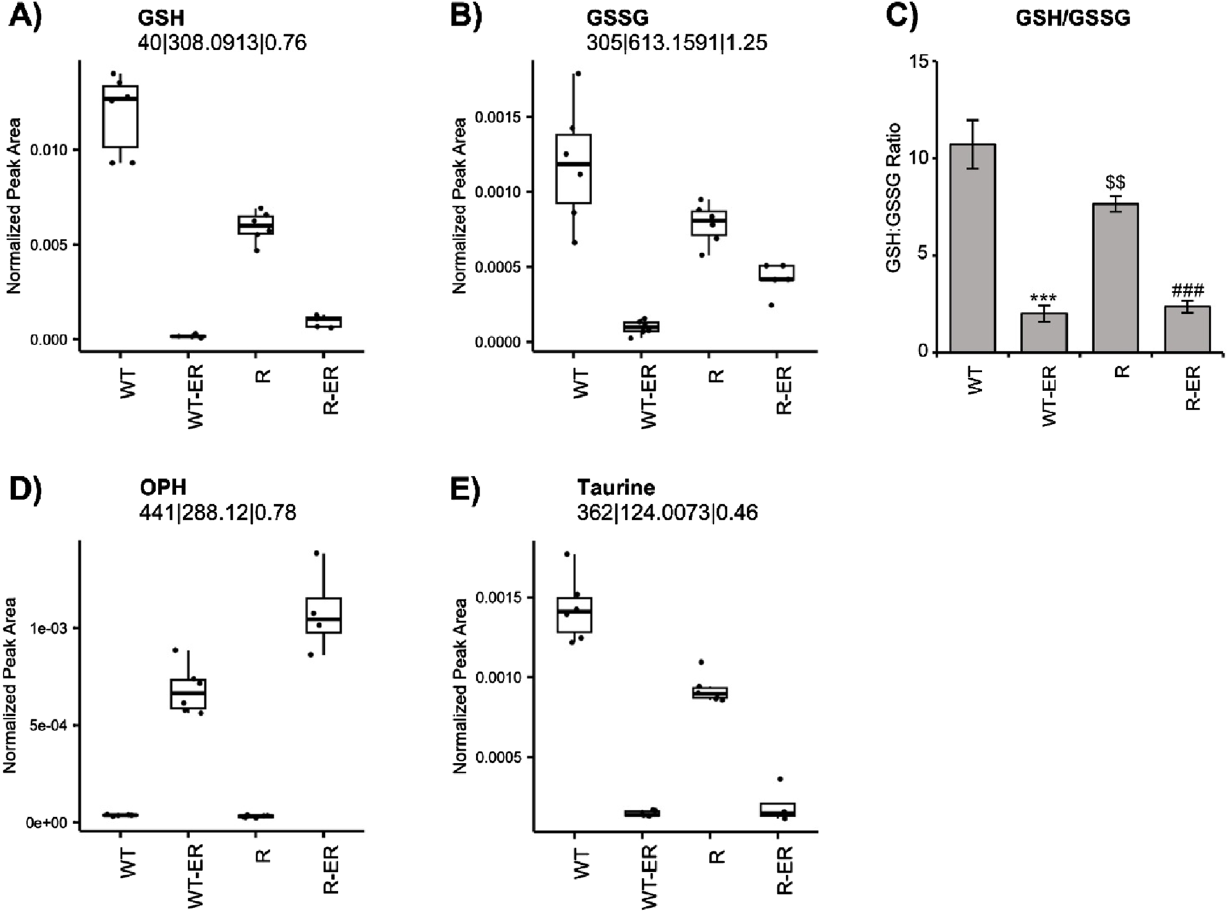 Redox changes resulting from Erastin (2.5 µM) treatment at 24 h in WT and R cells. Metabolomic measurement of (A) GSH (B) GSSG and (C) calculated levels of GSH/GSSG ratio. Error bars represent SD. Metabolomic measurement of levels of (D) OPH and (E) Taurine. ***, ### p values of <0.001 compared to untreated controls and $$ p values <0.005 compared to untreated WT, respectively.