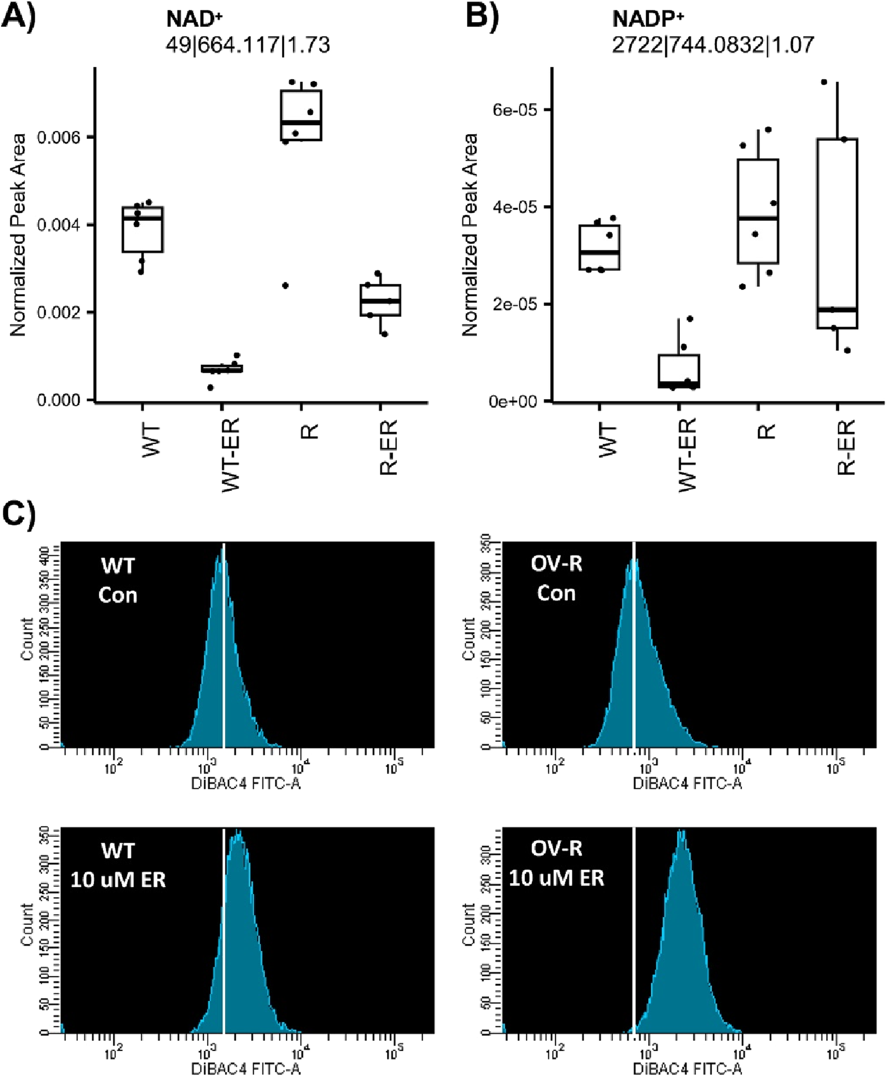 Furthermore, depletion of NAD+/NADH has been shown to leads to membrane depolarization, mitophagy and cell death via apoptosis or ferroptosis (McKay-Corkum et al., 2023; Zhu et al., 2022). Therefore, we examined effects of ER on cellular stability utilizing DiBAC4(3), a dye specific for studying plasma membrane polarization/depolarization in cells. Results presented in Figure 3C clearly shows that ER induced significant polarization of both cells within 4 h of treatment. Moreover, NCI/ADR-RES (R) cells were more sensitive to this depolarization than OVCAR-8 cells (WT).
