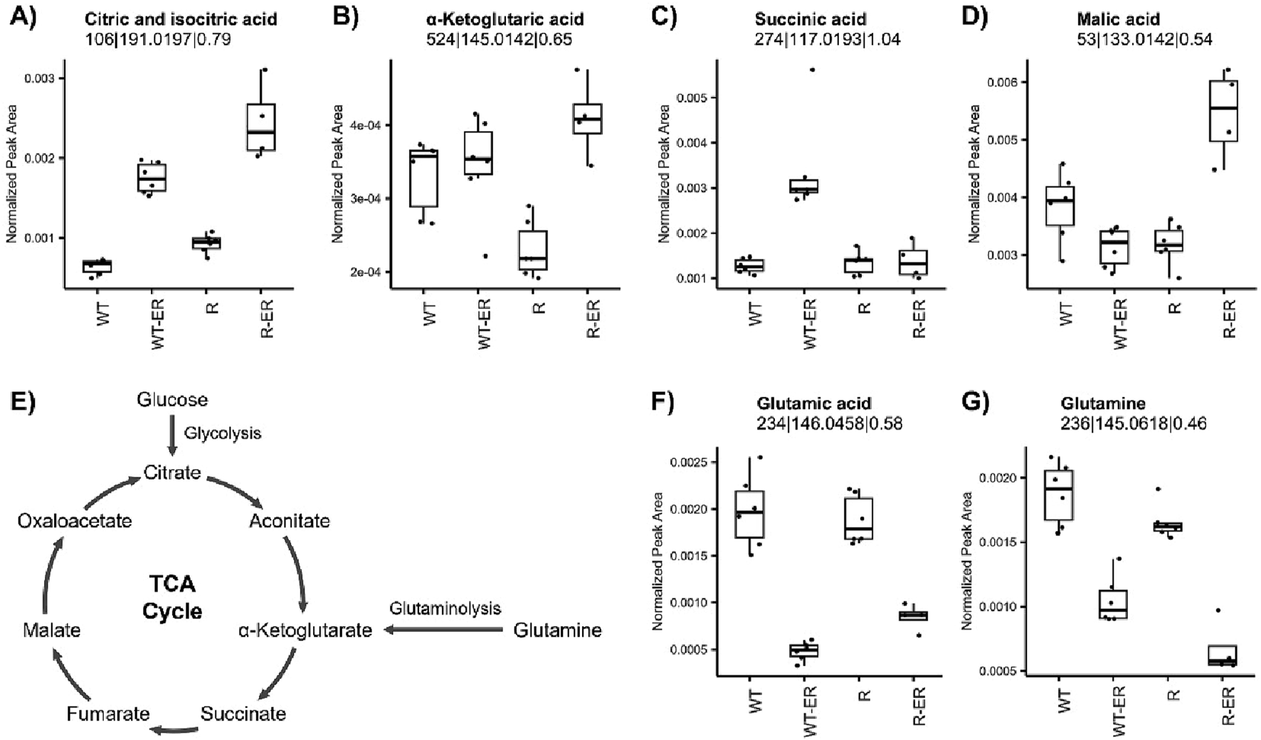 Influence of ER treatment on TCA cycle and glutaminolysis energy metabolism in WT and R cells. Metabolomics measurement of (A) iso- and citric acid, (B) α-ketoglutaric acid, (C) succinic acid, and (D) malic acid in the (E) TCA cycle. Glutaminolysis metabolites, (F) glutamic acid and (G) glutamine, measured by metabolomics.