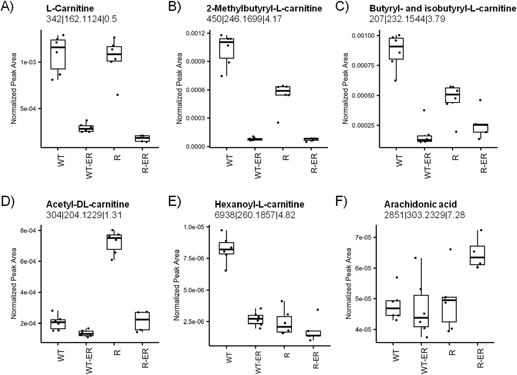 Modulation of lipid metabolism by ER in WT and R cells. Metabolomics measurement of (A) L-carnitine, (B) 2-methylbutyryl-L-carnitine, (C) iso- and butyryl-L-carnitine, (D) acetyl-DL-carnitine, (E) hexanoyl-L-carnitine, and (F) arachidonic acid.