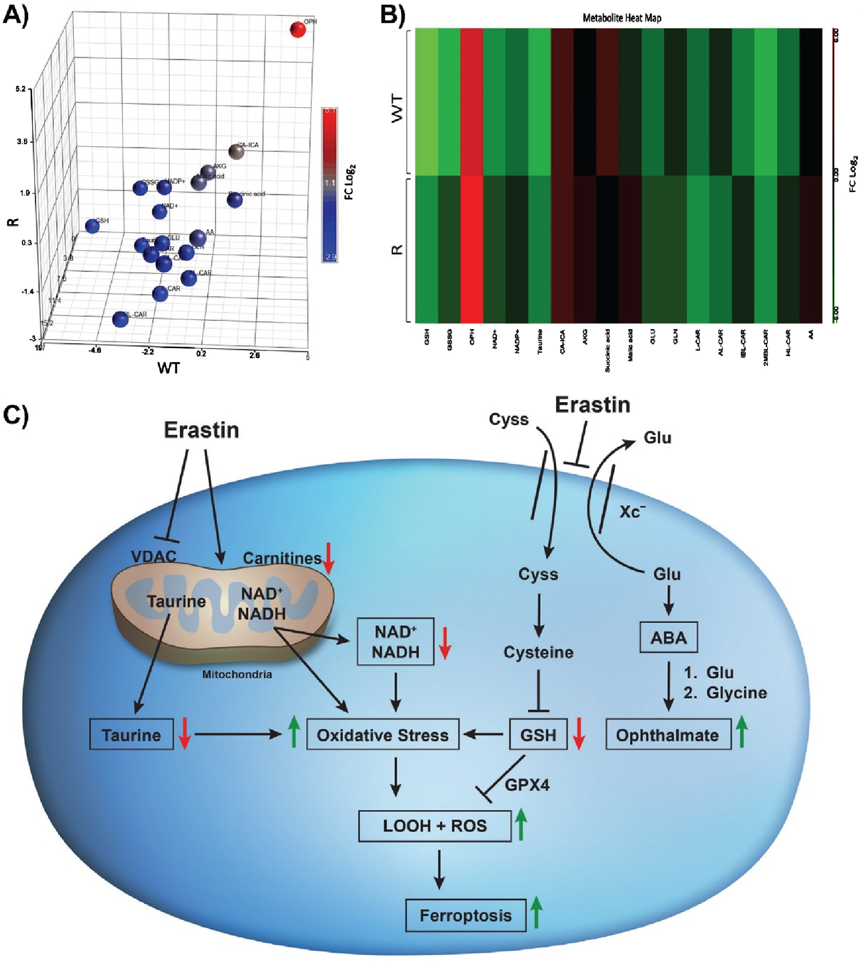 As ER has been shown to cause GSH depletion by inhibiting Xc-transporter, leading to ROS/Lipid ROS formation in a wide variety of tumor cells (Zhao et al., 2020; Shintoku et al., 2017) loss of cellular GSH has become a hallmark of ferroptotic cell death and redox balance is central to the ferroptosis process. Untargeted metabolomics data revealed a significant reduction in GSH in WT-ER and R-ER cells compared to untreated WT and R cells. GSSG, a metabolite of glutathione oxidation, was decreased in WT-ER to a greater extent than in R-ER cells. The differences in initial GSH and GSSG levels between WT and R cells can make interpretation of the redox couple complicated, therefore, the ratio of GSH:GSSG was used (Figure 2C). Interestingly, the ratio of GSH:GSSG was similar between WT-ER and R-ER cells, indicating similar oxidative stress in both cell types. Soga et al. (Soga et al., 2006) have shown that decreases in GSH caused following treatment with acetaminophen induces increases in the formation of opthalmate (OPH) in liver. Formation of OPH in cells/blood has been proposed as a biomarker of oxidative stress (Soga et al., 2006; Dello et al., 2013). In this study, we also observed significant increases in OPH formation in both cell lines (Figure 2) with concomitant decreases in both GSH and taurine, a cellular antioxidant. Further exploration of the metabolomics data indicated a statistical difference in the levels of OPH (Figure 2D). An increase in OPH was observed in the ER-treated cells with the greatest levels observed in R-ER cells. OPH is a reported biomarker of oxidative stress in cells/blood (Soga et al., 2006; Dello et al., 2013); however, the precise roles of OPH are unknown. It is proposed that OPH serves as a tripeptide regulator of glutathione (Schomakers et al., 2024). We have previously reported decreases in taurine during NCX4040-induced ferroptosis in colon cancer cells (Sinha et al., 2023). Therefore, our study lends support for ophthalmate formation in cells along with taurine as possible biomarkers for ferroptotic cell death.