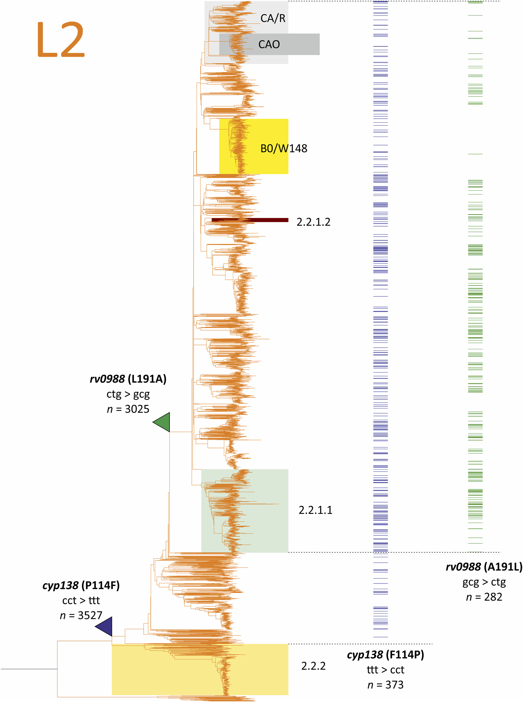 The maximal parsimony model of selection of lineage 2 specific 2N substitutions cyp138(P114F) and rv0988(L191A) from the analysis of 9,941 Mycobacterium tuberculosis genomes of the CRYpTIC study. The branches where probable direct substitutions occurred are pointed with color triangles, reversions are shown as distributions in terminal branches (isolate genomes). Number of isolates with mutations in the whole CRYpTIC set are given unadjusted.