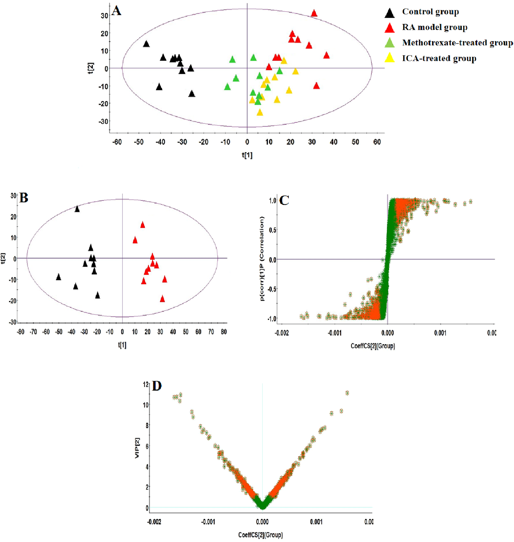 Score plots of the (A) principal component analysis (PCA) model of the control, RA, methotrexate-treated, and ICA-treated groups in ESI+ mode; (B) orthogonal partial least-squares discriminant analysis (OPLS-DA) of data between the control and RA groups in the ESI+ mode. (C) S-plot of the OPLS-DA model for the control and RA groups in ESI+ mode. (D) Variable importance in projection (VIP) score plot of the OPLS-DA model for the control and RA groups in ESI+ mode.