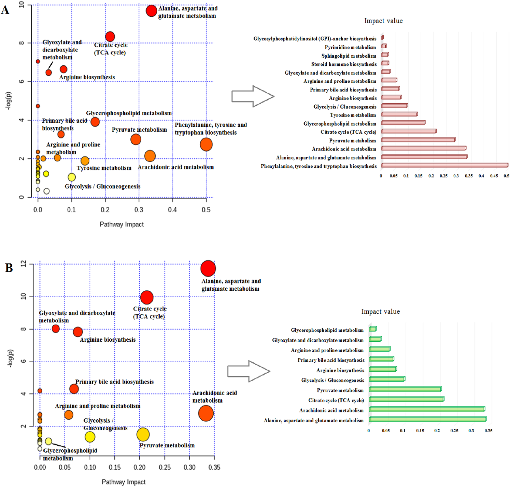 After ICA treatment, 23 of the above biomarkers, including 17a-estradiol, 5-methylcytidine, arachidonic acid, arginine, aspartic acid, Cer(d18:0/18:0), citric acid, glutamine, glycochenodeoxycholate, isocitric acid, L-aspartyl-4-phosphate, L-glutamate, LysoPC(15:0), LysoPC(18:0), succinic acid, LysoPC(18:1), phytanic acid, PGE2, pyruvic acid, LysoPE(0:0/20:0), taurochenodeoxycholate, taurocholic acid, and vitamin K2, were found to be altered. A heatmap was established (Figure 7) to describe the changed trends in the four groups, where the dark areas indicate increased content and light areas indicate decreased content; meanwhile, vertical cluster analysis was used to indicate metabolites with similar chemical properties and types, while horizontal cluster analysis was used to indicate samples with similar degrees of changes. As shown in Figure 8, compared with the RA model group, 17a-estradiol, 5-methylcytidine, arginine, aspartic acid, cer(d18:0/18:0), citric acid, isocitric acid, L-glutamate, LysoPC(15:0), LysoPC(18:0), LysoPC(18:1), phytanic acid, pyruvic acid, LysoPE(0:0/20:0), and vitamin K2 levels were significantly upregulated in the ICA-treated group; in contrast, arachidonic acid, glutamine, glycochenodeoxycholate, L-aspartyl-4-phosphate, succinic acid, PGE2, taurochenodeoxycholate, and taurocholic acid levels were significantly downregulated in the ICA-treated group. The changes in the potential biomarkers were similar in the methotrexate-treated and ICA-treated groups. The results show that the concentrations of metabolites in the ICA-treated group were mostly between those in the control and RA model groups, indicating that ICA treatment may assist in protecting against RA by regulating the levels of these metabolites to values close to those in the control group.