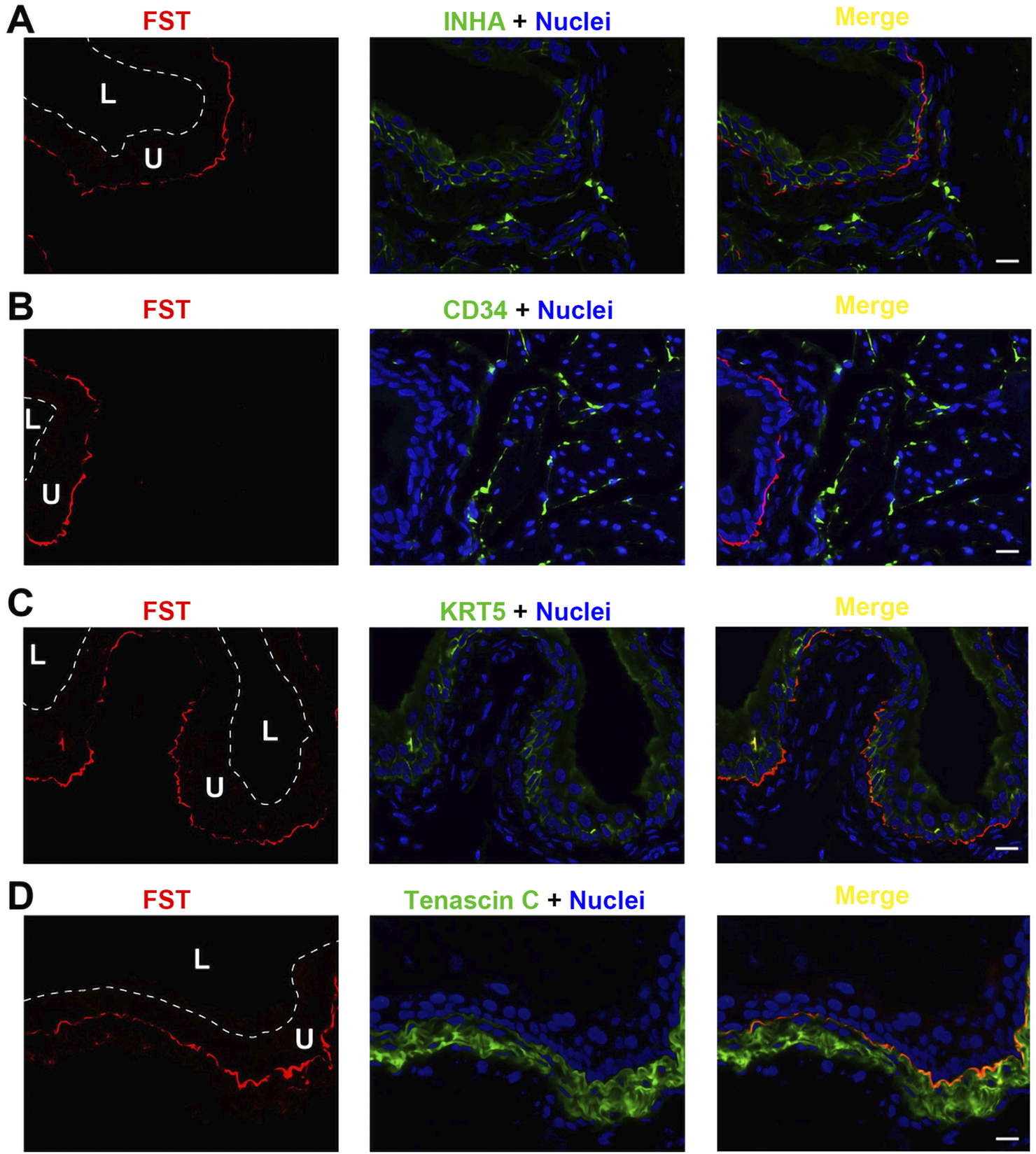 Figure 5. Localization of FST in mouse bladder. Cryosections of mouse bladder tissue were labeled with FST antibody (red) and INHA (A), or antibodies to CD34 (B), or KRT5 (C) or Tenascin C (D); all displayed in green. Nuclei were labeled with DAPI (blue). Far right: merged images. L, bladder lumen. U, urothelium. Scale bars = 10 μm.