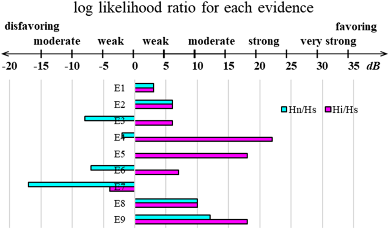 Figure 5. Qualitative Bayesian scale and summary plot of the logs of the ratios of likelihoods for each of the nine listed pieces of evidence for each discussed pairwise comparison. The X-axis is measured in decibels (dB).