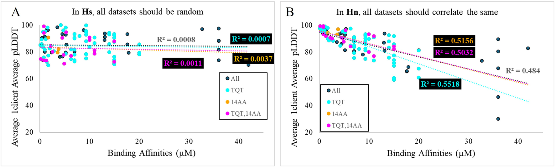 E4: The scores of the full, heterogeneous dataset do not correlate with the binding affinities for each; however, the scores of several of the homogeneous subsets do correlate with affinities. In Hs, the first part of this piece of evidence is very likely, but combined with the second part of the statement, it becomes very unlikely. As shown in Figure 6A, all datasets should be random, but with high confidence, in the context of Hs because pLDDT should vary randomly, with no association to affinity. For Hn, the opposite holds true, where the homogeneous datasets would be expected to correlate, but the full dataset would be expected to correlate in the same way, as is shown in Figure 6B. For Hi, it is very likely for both things to co-occur. An inaccurate energy function will successfully exhibit correlations with affinities in datasets consisting of clients with similar properties; however, when several of these datasets are overlaid, their dissimilar correlations will obscure one another (Figure 4). Hn/Hs is −2 dB, and Hi/Hs is 22 dB.