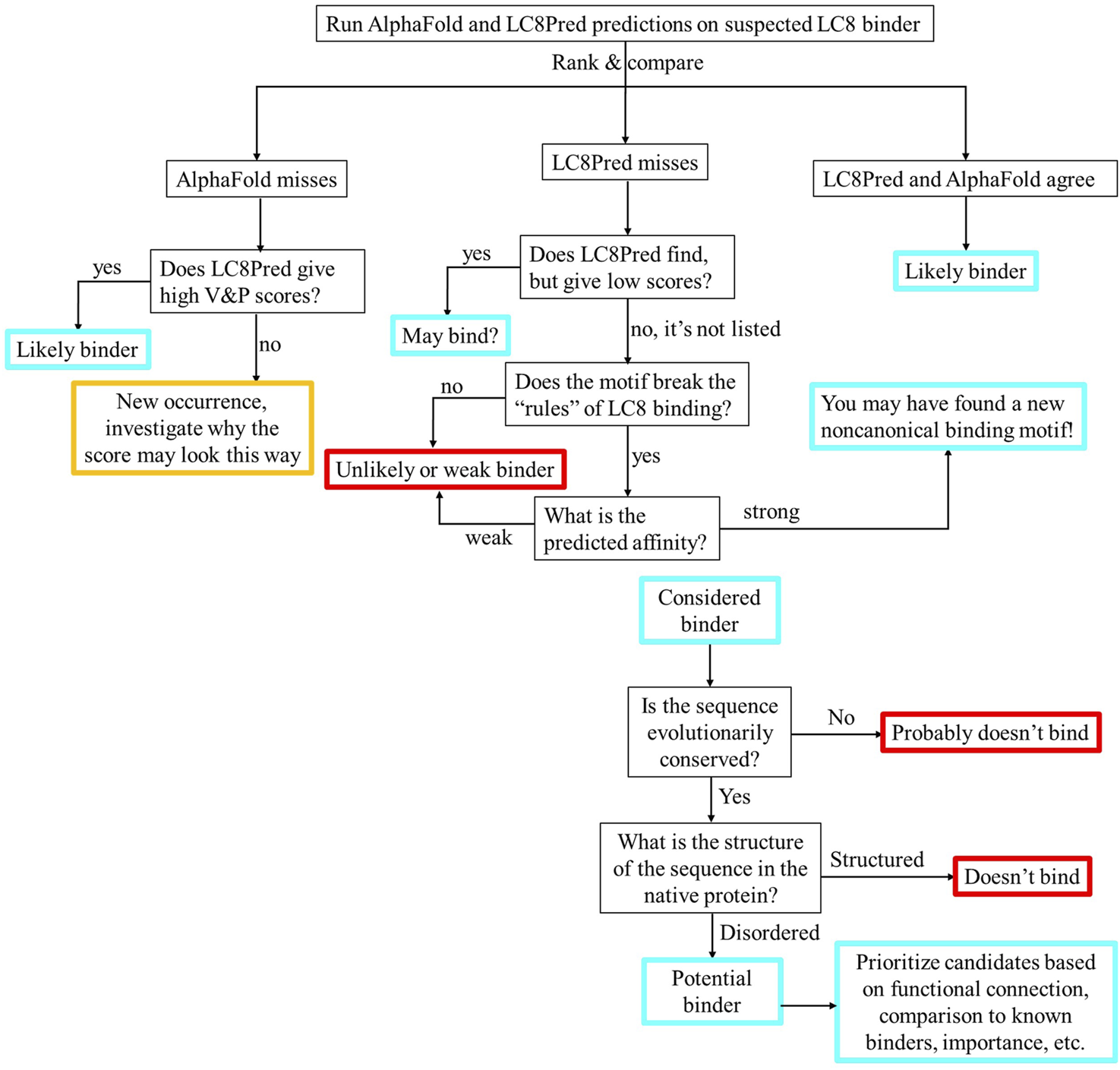 Given this context, AlphaFold is a promising tool for complementing our predictions of LC8 interactions through its general knowledge of proteins. However, for applications such as this, it is advised and important to include examples of nonbinders (Lee et al., 2024). Suggested approaches include randomizing protein sequences or mutating the SLiM to polyalanine. Similarly, concerns have been raised about the multiple different versions of AlphaFold and metrics used to distinguish its ability to accurately assess binding (Lee et al., 2024). In this work, we investigate AlphaFold’s ability to distinguish proteins that bind LC8 from known nonbinders. We establish criteria to distinguish binders from nonbinders based on AlphaFold’s pLDDT, PAE, pTM, and ipTM scores. We explore the potential for AlphaFold scores to correlate with binding affinities as might be expected if AlphaFold has learned something about protein folding energetics. Finally, we apply these lessons to predict new LC8 binding sites in a selection of proteins that (1) are known to, but not where, bind LC8, (2) are not predicted by LC8Pred, or (3) for which LC8Pred predicts that more sites may exist than have been experimentally found. LC8Pred and AlphaFold predictions are compared to guide hypothesis generation and experimental design to find new LC8 binding sites.