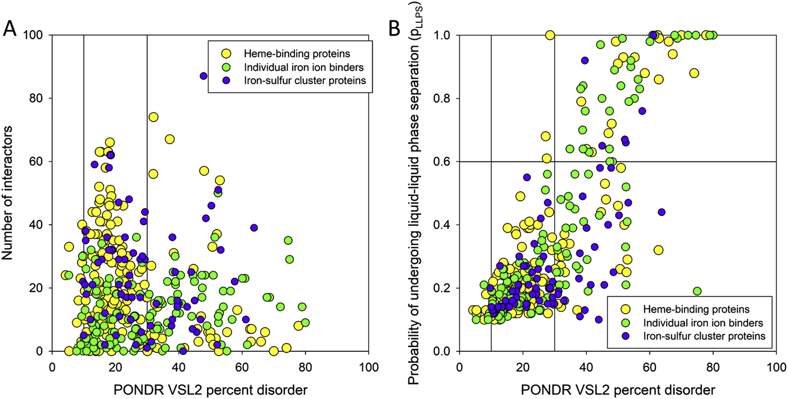 (A) Dependence of the number of interactors within the ironome PPI network on the PPIDR level of the human heme-, iron ion-, and iron-sulfur cluster-binding proteins. Vertical lines show 10% and 30% thresholds. (B) Comparison of the LLPS predisposition of the members of human ironome with their intrinsic disorder propensity. Vertical lines show 10% and 30% thresholds, whereas the horizontal line corresponds to the 0.6 pLLPS threshold.