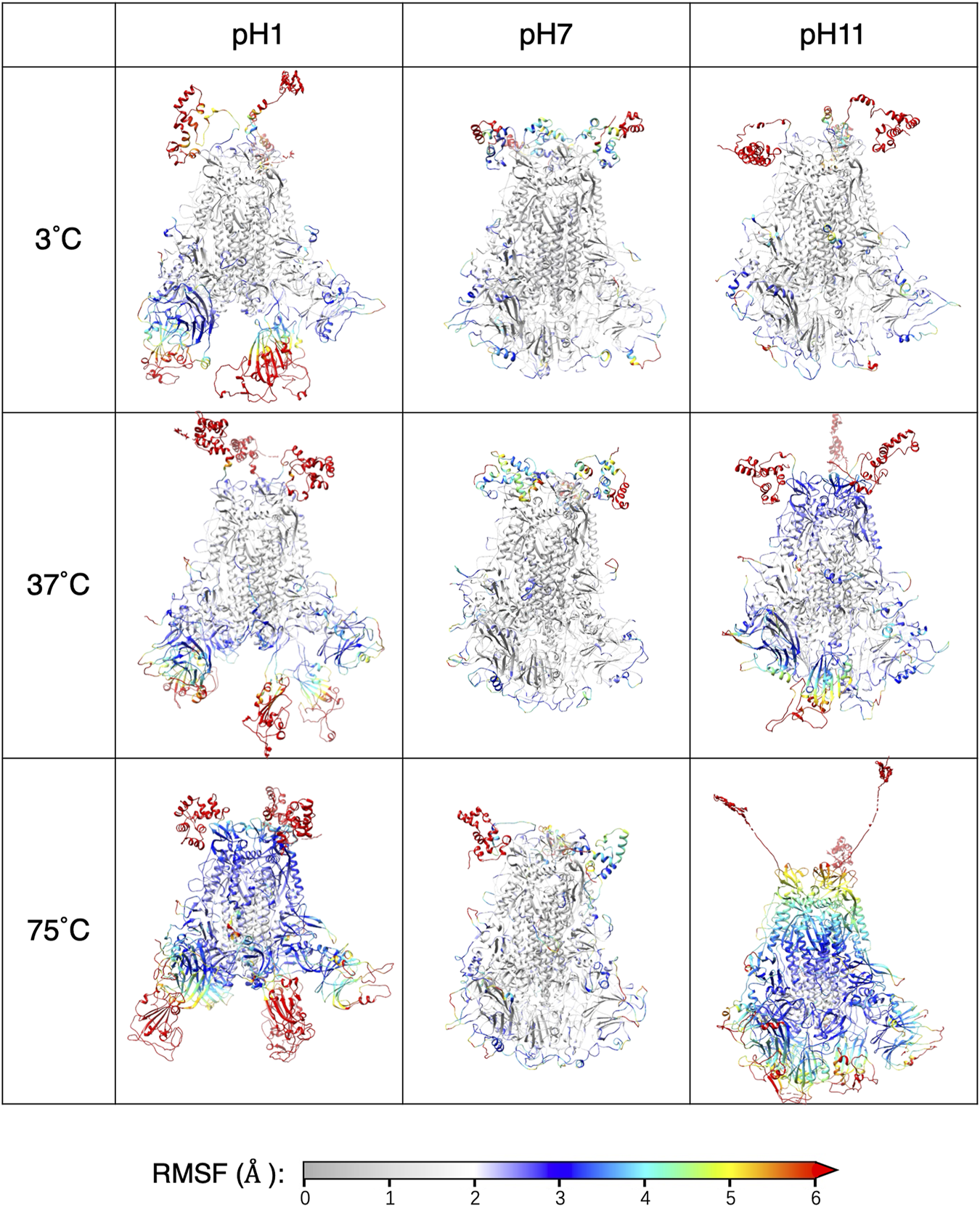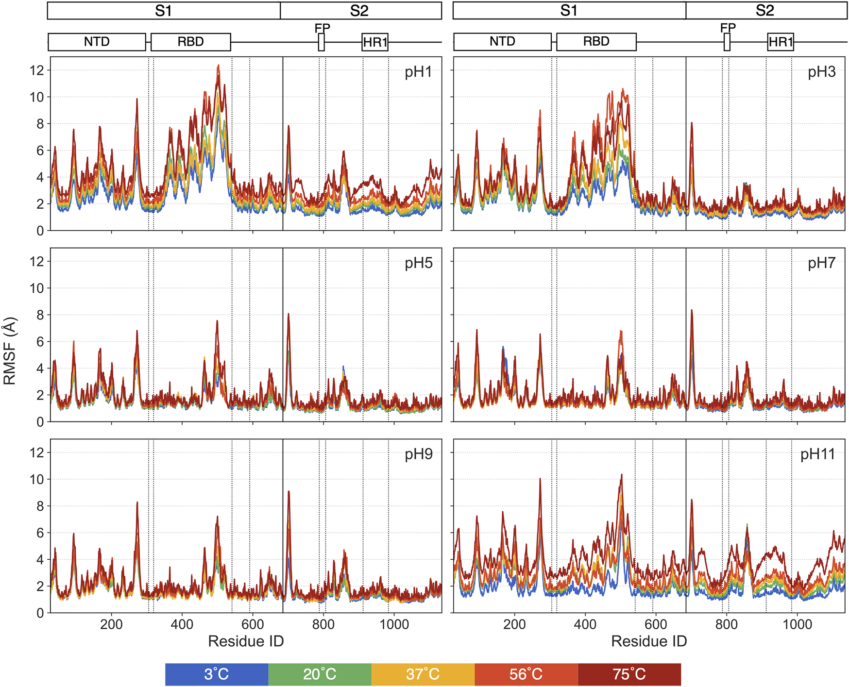 Based on recent in vitro and in silico studies (Chin et al., 2020; Xie et al., 2022), we design simulations for six pH levels and five temperatures, resulting at 30 unique conditions, with triplicates conducted for each. The choice of pH = 1 represents an extremely acidic environment, allowing us to examine potential structural changes or denaturation in the S-protein under highly acidic conditions. Examining the limits of S-protein stability at such extreme acidity provides valuable insights into its structural resilience and mechanisms of denaturation. By comparison, pH = 3 and 11, while less extreme, are included to assess whether critical points exist where notable structural changes occur. The mild pH = 5, 7, and 9 conditions permit evaluations of the S-protein stability at conditions that resemble the human body physiological environment.
