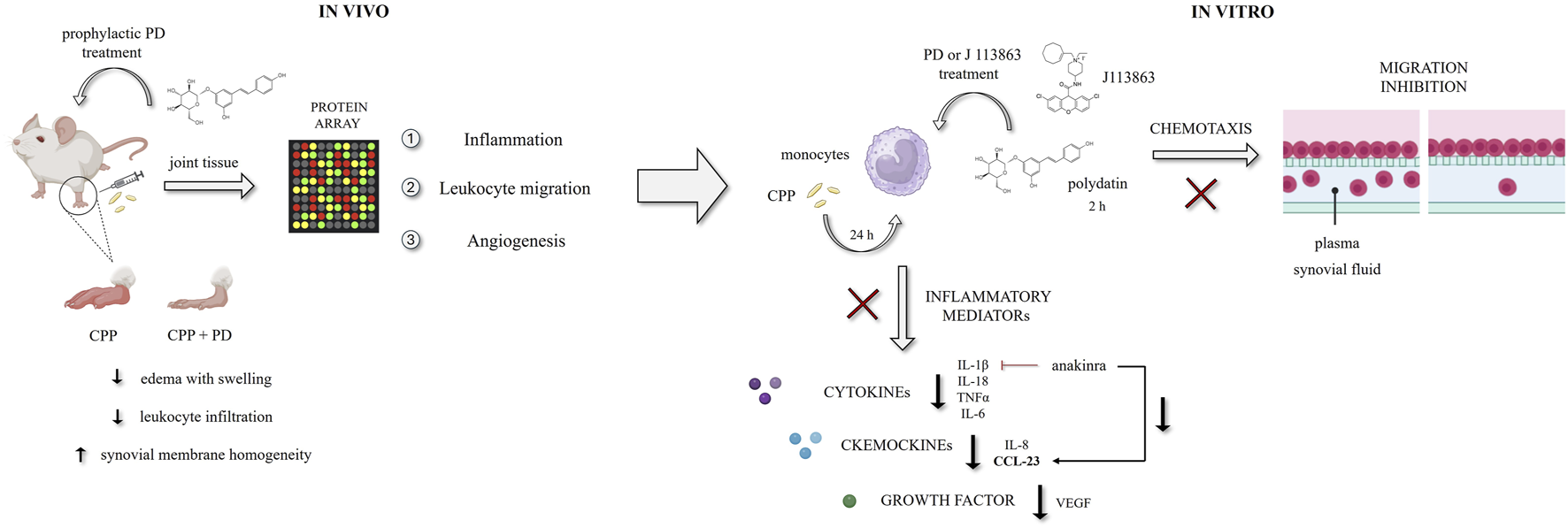 Therefore, in this study we aimed at evaluating the effect of PD in a mouse model of acute arthritis induced by CPP crystal injection in the ankle. Additionally, we conducted in vitro experiments to explore the mechanisms underlying PD anti-inflammatory effects. In particular, we focused on specific pathways overexpressed in the joints of mice following treatment with crystals, including leukocyte migration, proinflammatory mediators and angiogenesis.