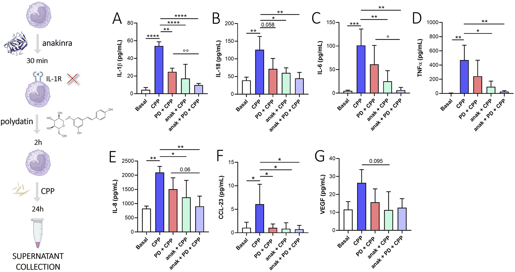 Effect of IL-1β signal inhibition on PD treatment. Monocytes were pretreated with PD (100 µM) for 2 h and then stimulated for 24 h with CPP (0.025 mg/mL). Where indicated, anakinra (anak, 0.1 µg/mL) was added 30 min before the PD treatment. (A) IL-1β, (B) IL-18, (C) IL-6, (D) TNFα, (E) IL-8, (F) CCL-23 and (G) VEGF levels in supernatants were quantified by ELISA. Data are expressed as mean of four independent experiments ±SD. p calculated according to the One Way Anova, Bonferroni’s multiple comparisons test: *p < 0.05, **p < 0.01, ***p < 0.001, ****p < 0.0001. p calculated according to t-test, PD + CPP vs anak + PD + CPP: °p < 0.05, °°p < 0.01. CPP, calcium pyrophosphate crystals; PD, polydatin; anak, anakinra.