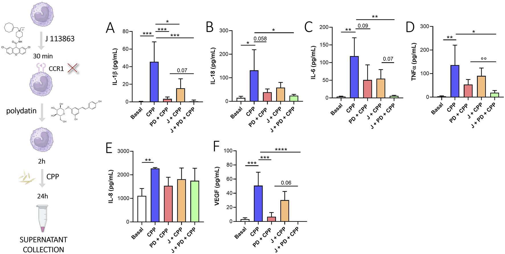 Effect of CCR1 inhibition on PD treatment. Monocytes were pretreated with PD (100 µM) for 2 h and then stimulated for 24 h with CPP (0.025 mg/mL). Where indicated, J113863 (10 µM) was added 30 min before the PD treatment. (A) IL-1β, (B) IL-18, (C) IL-6, (D) TNFα, (E) IL-8, (F) VEGF levels in supernatants were quantified by ELISA. Data are expressed as mean of four independent experiments ±SD. p calculated according to the One Way Anova, Bonferroni’s multiple comparisons test:*p < 0.05, **p < 0.01, ***p < 0.001, ****p < 0.0001. p calculated according to t-test, PD + CPP vs J + PD + CPP: °°p < 0.01. CPP, calcium pyrophosphate crystals; PD, polydatin.