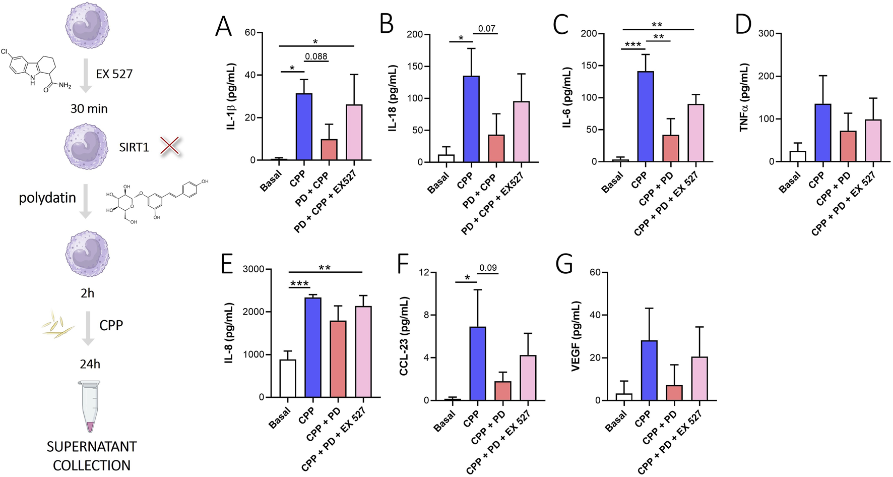 Among the mechanisms of action proposed in the literature, SIRT-1 activation by PD has been reported (Sun et al., 2021). However, no evidence was found regarding CPP crystal-induced inflammation. In our experimental model, inhibition of SIRT-1 through EX527, reverts PD-mediated reduction of IL-1β, IL-18, IL-6, IL-8, CCL-23 and VEGF (Figure 6).