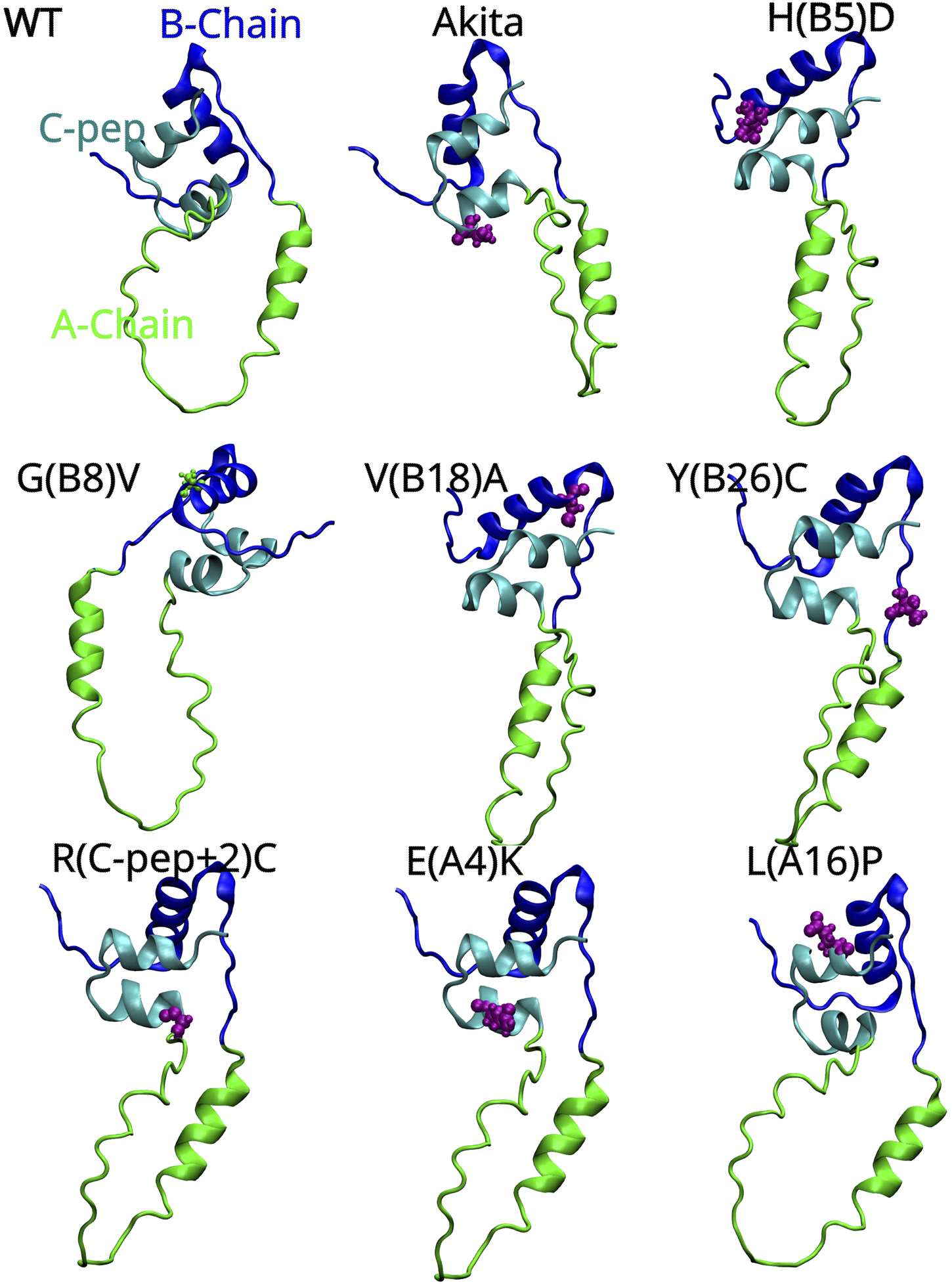 Figure 2. AlphaFold-predicted 3D structures of human proinsulin with the A-Chain, B-Chain and C-peptide represented as green, blue and cyan colored ribbons respectively. The locations of the Akita (C (A7)Y) and MIDY mutations are shown in pink color and van der Waals spheres showing their 3D location with respect to the three key regions of proinsulin. The proinsulin mutant nomenclature is as follows: H(B5)D means Histidine, which is the fifth amino acid on the B-chain, is replaced with Aspartic acid.