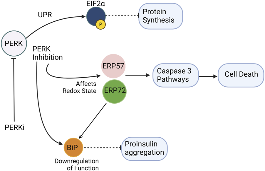 Figure 3. PERK inhibition disrupts ER homeostasis and promotes proinsulin misfolding. PERKi (PERK inhibitor) impairs translational attenuation, alters the ER redox environment, and downregulates chaperone function. Specifically, PERKi prevents the phosphorylation of eIF2α, leading to increased protein synthesis and exacerbating ER stress. Additionally, PERKi can affect the redox state of ER oxidoreductases like Erp72 and Erp57, potentially reducing the activity of the ER chaperone BiP. These combined effects result in the accumulation of misfolded proinsulin, contributing to ER dyshomeostasis in β-cells. Separately, Erp57 suppression results in elevated cleaved Caspase-3, indicating increased apoptosis. Dashed inhibitory arrows indicated weakened effects.