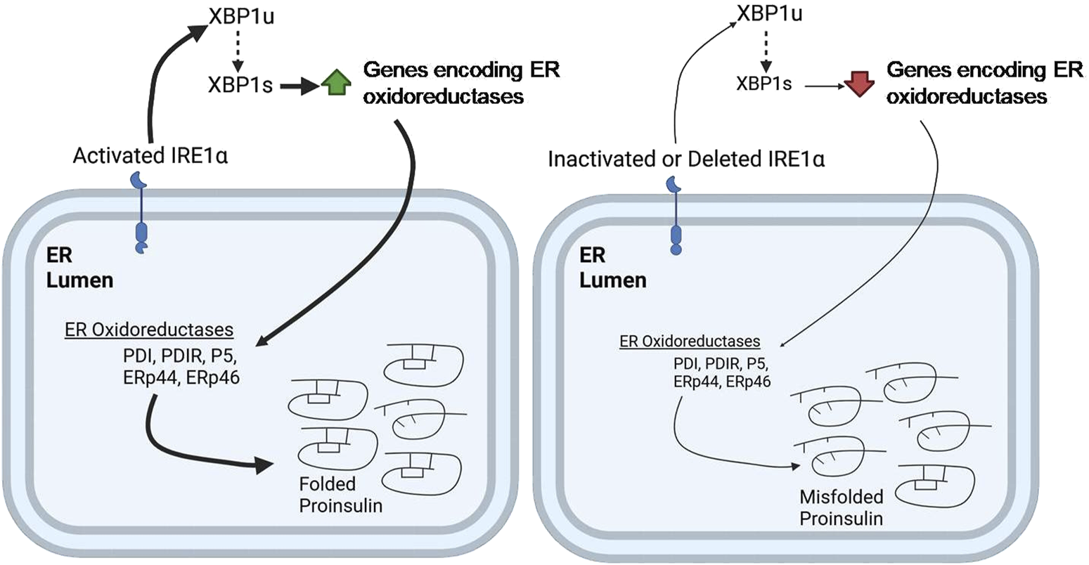 UPR triggers IRE1α–XBP1 pathway and the activation of IRE1α′s RNase domain by ER stress causes the cleaving of unspliced XBP1 (XBP1u) mRNA (X-box-binding protein 1). The spliced form, XBP1s, then acts as a transcriptional activator that upregulates specific gene encoding ER chaperones, ERAD proteins, and lipid synthesis enzymes. Tsuchiya et al., 2018 suggested that the IRE1α–XBP1pathway controls the expression of several protein disulfide isomerases (PDIs), including PDI, PDIR, P5, ERp44, and ERp46, which are essential for the oxidative folding of proinsulin (Tsuchiya et al., 2018). It was shown that inactivation of the IRE1α-XBP1 pathway leads to decreased expression of these PDIs, resulting in impaired proinsulin folding and reduced insulin production. Conversely, overexpression of these PDIs can restore insulin secretion. These findings highlight the importance of the IRE1α-XBP1 pathway in regulating proinsulin folding and the essential role of PDIs in this process (Tsuchiya et al., 2018) (Figure 4). Additionally, the deletion of Xbp1 in mouse β-cells primarily affects the expression of mRNA encoding insulin, impacting its processing and secretion (Tsuchiya et al., 2018). This further underscores the complex role of the IRE1α-XBP1 pathway in maintaining β-cell function and insulin production.