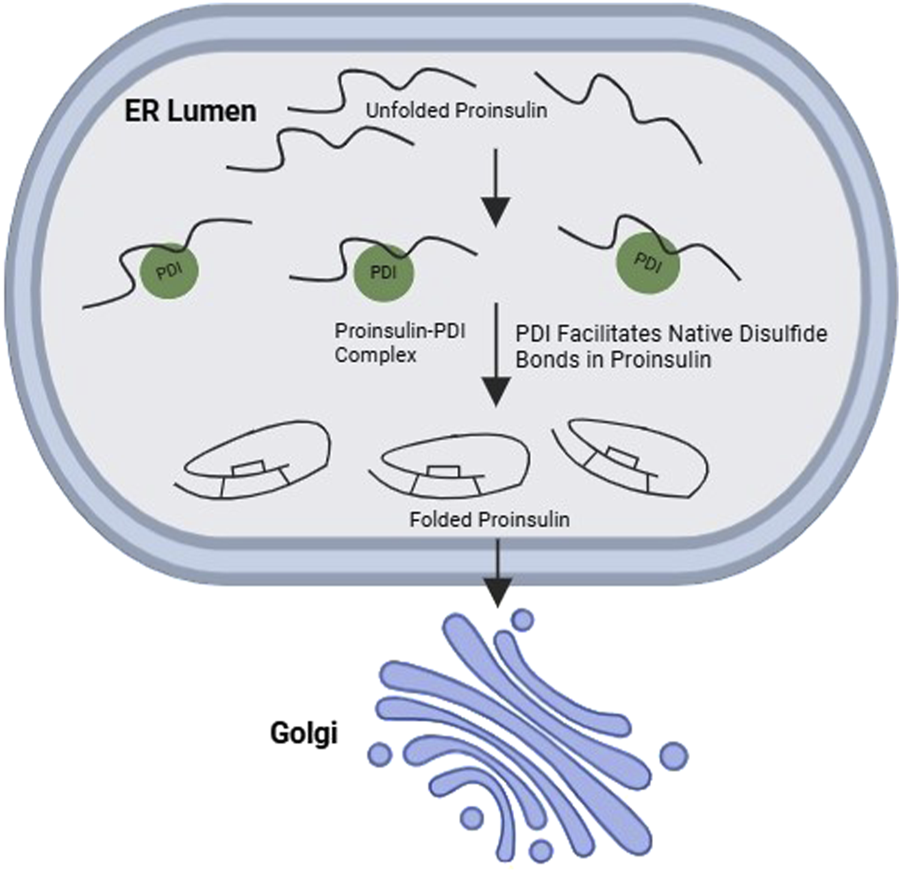 PDIA1, a member of the PDI family facilitates the formation of correct disulfide bonds within proteins. A recent study showed that PDIA1 is essential for proper insulin production under metabolic stress conditions (Jang et al., 2019). β-cells lacking PDIA1 exhibit a range of impairments, including the accumulation of misfolded proinsulin aggregates, disruptions in the transport of vesicles from the ER to the Golgi apparatus, and a decrease in insulin granule content. These findings underscore the critical role of PDIA1 in the oxidative maturation of proinsulin within the ER. In response to PDIA1 deficiency, β-cells attempt to compensate by overexpressing BiP, possibly to refold the largely misfolded proinsulin. Overall, PDIA1’s disulfide isomerase activity helps lessen misfolded proteins and maintain ER homeostasis.