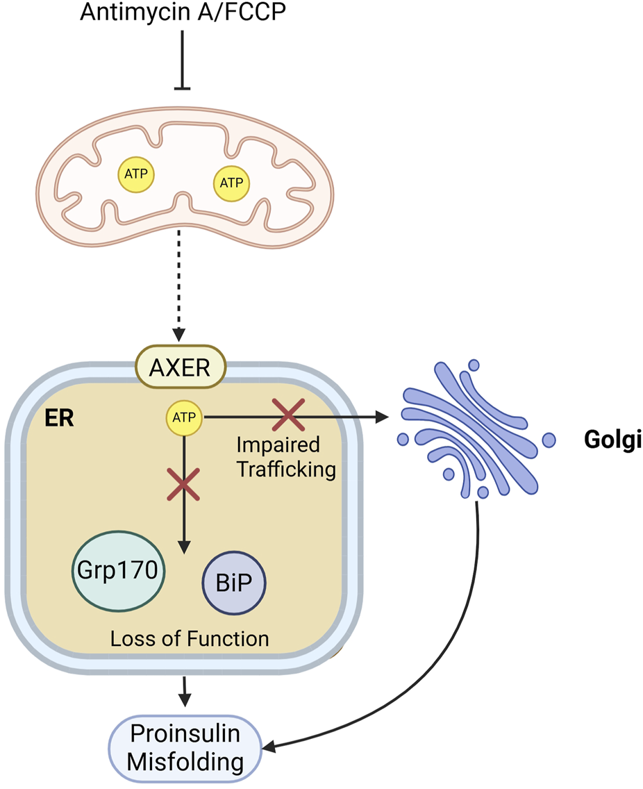 Figure 6. Mitochondrial energy supply supports proinsulin folding and ER-to-Golgi transport. Mitochondrial ATP depletion in β-cells by Antimycin A or FCCP treatment, could impact proinsulin folding by affecting the function of ATP-dependent ER chaperones like BiP or by impairing proinsulin trafficking from the ER to the Golgi.Red crosses indicate blocked pathways, and dashed arrow indicated impaired mitochondria-to-ER ATP shuttling.
