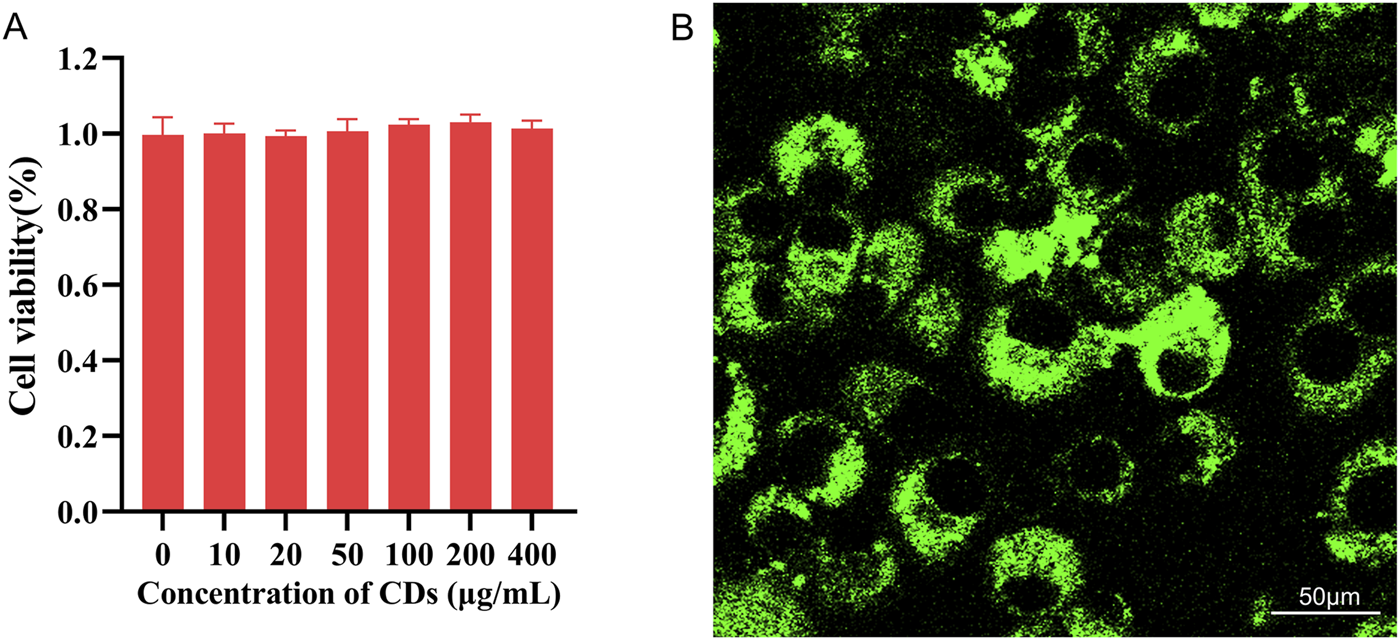 Figure 5. (A) Cell viability of MC3T3-E1 cells after 24-h incubation with various concentrations of CDs; (B) Fluorescence images of MC3T3-E1 cells incubated with CDs for 2 h under 488 nm filter irradiation. Scale bar:50 μm.