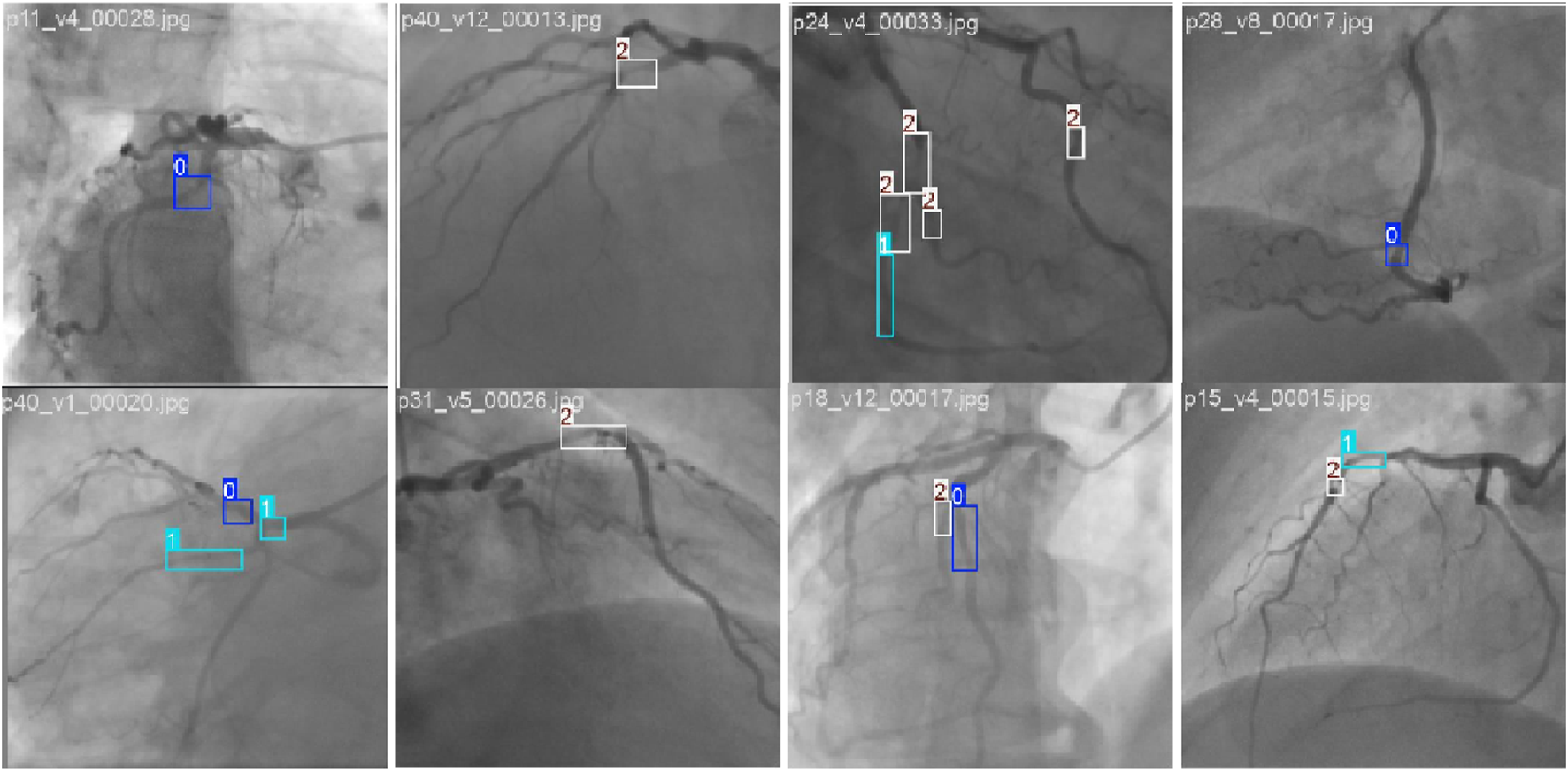 Example of stenosis detection and assessment images in the CADICA dataset. The 0, 1, and 2 denote the p0-50, p50-70, and p70-100 stenoses, respectively.